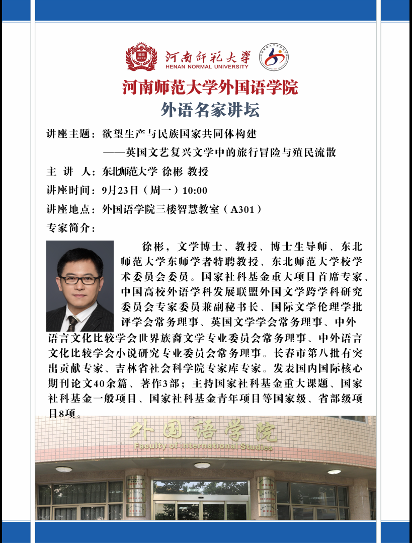 外语名家讲坛:欲望生产与民族国家共同体构建——英国文艺复兴文学中的旅行冒险与殖民流散