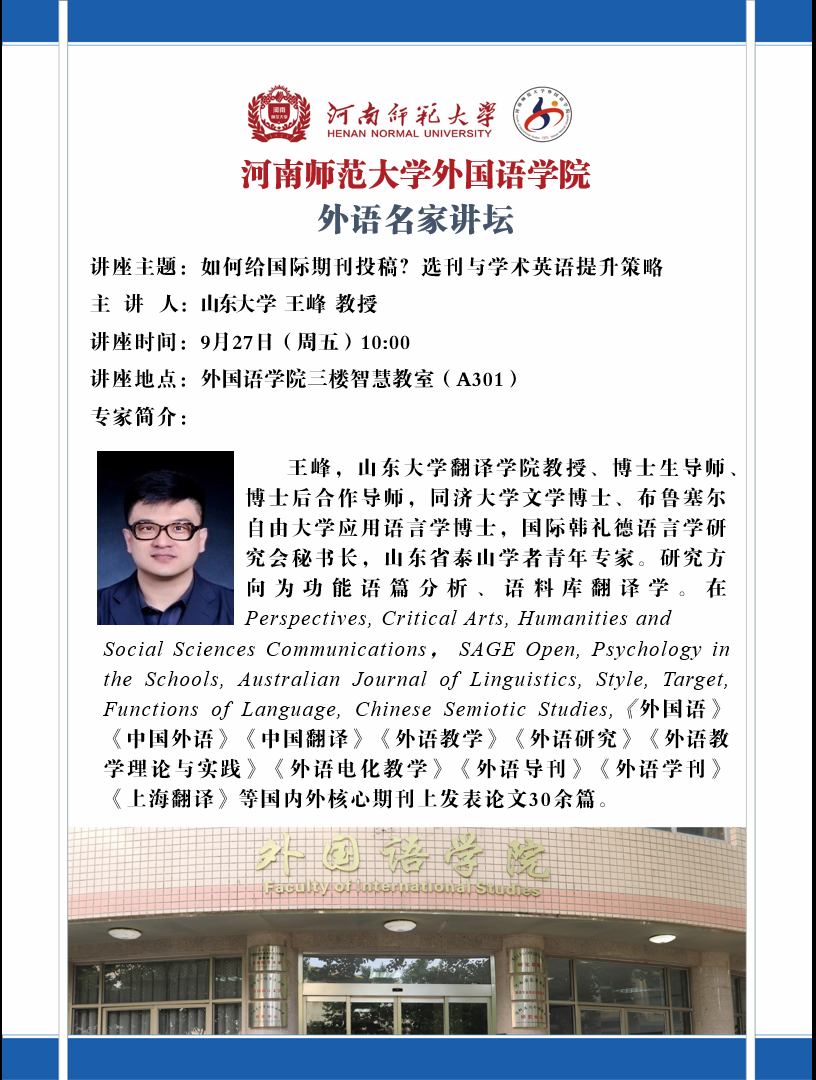 【预告】外语名家讲坛:如何给国际期刊投稿?选刊与学术英语提升策略 山东大学 王峰 教授