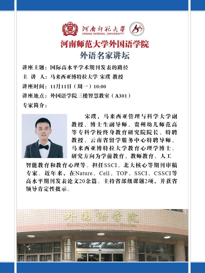 【预告】外语名家讲坛:国际高水平学术期刊发表的路径 马来西亚博特拉大学 宋璞 教授