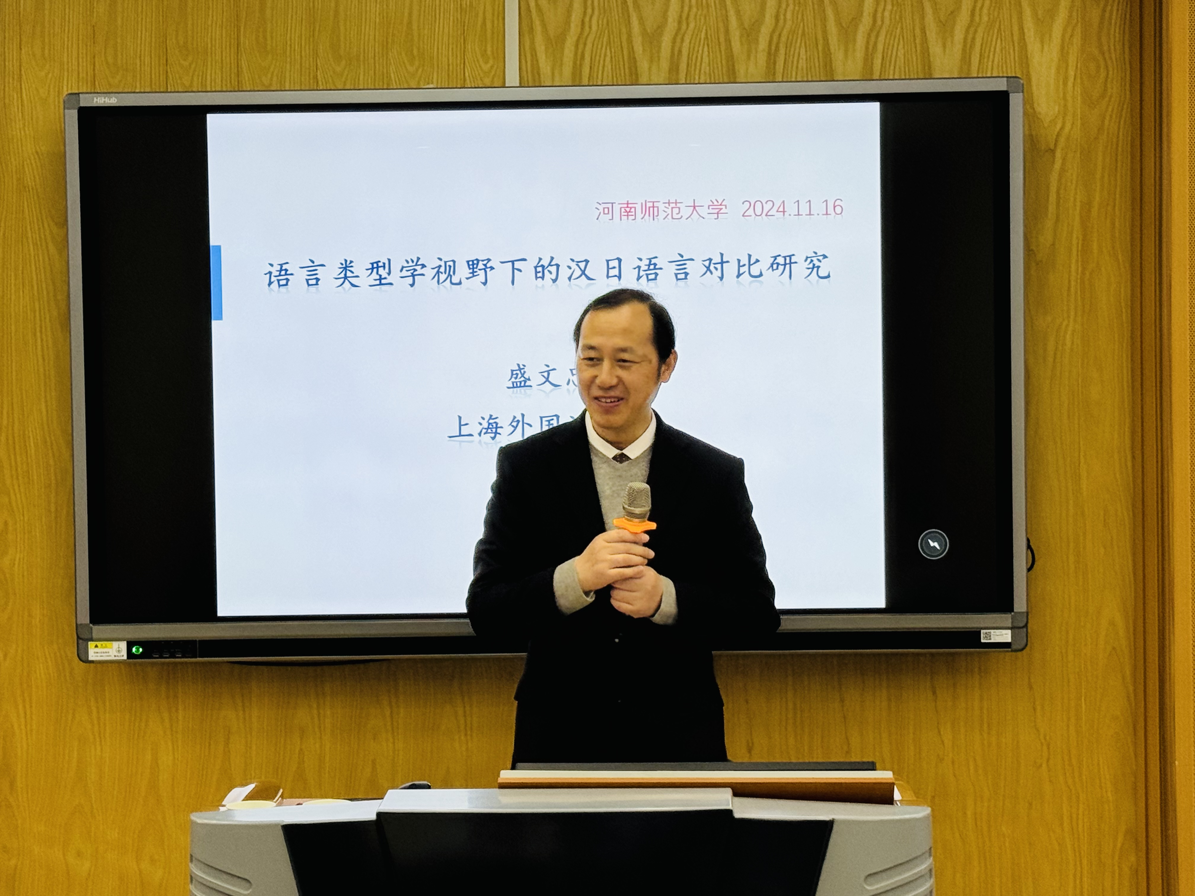 11月16日,应外国语学院邀请,上海外国语大学盛文忠教授在学院A301室作了两场题为“语言类型学视野下的汉日语言对比研究”和“如何进行日语语言学研究”的学术报告,学院近百名师生参会聆听。外国语学院日语系主任陈晓静主持报告。