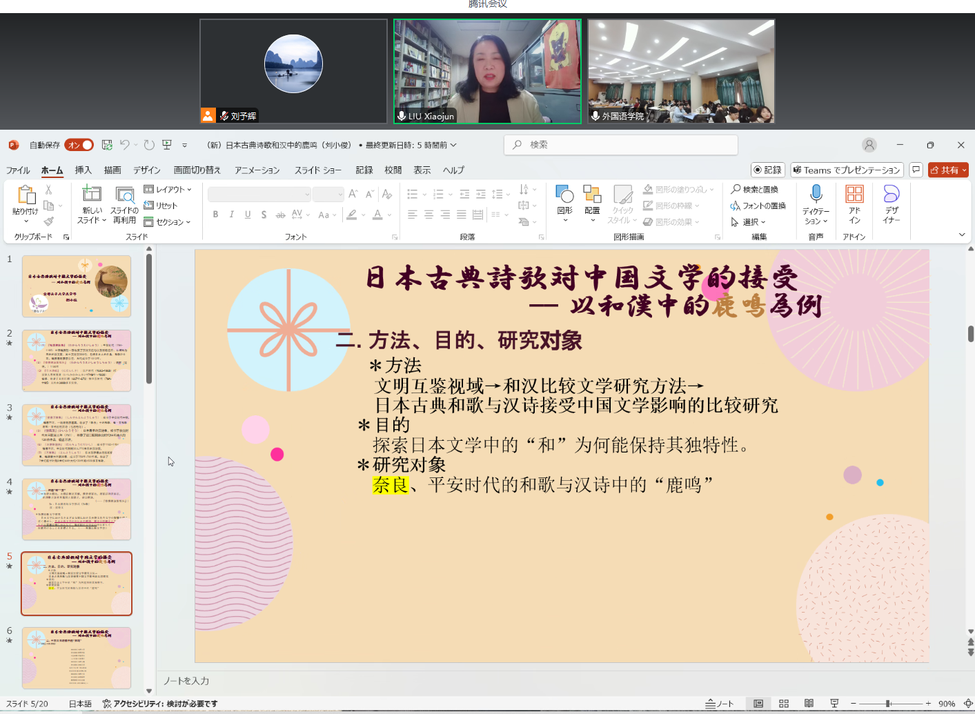 刘小俊从文明互鉴的视域出发,对日本文学内部存在的“和”与“汉”进行了比较研究。她指出,日本古典文学中有两种诗歌形式。一种是源于日本古代歌谣的“歌(うた)”即“和歌”,另一种是由来于中国的“诗()”,也称“汉诗”。她通过对汉诗与和歌中的“鹿鸣”用例及用法的比较研究和分析,剖析了两者在借鉴中国文学上所表现出的不同态度,进一步阐释了日本“和”文学在吸收大量中国文学的影响下仍能保持独特性的原因。报告结束后,刘小俊与师生进行了互动答疑。通过此次报告,聆听者对中日文学中的鹿鸣有了清晰的认知,拓宽了学术视野,启迪了科学思维。