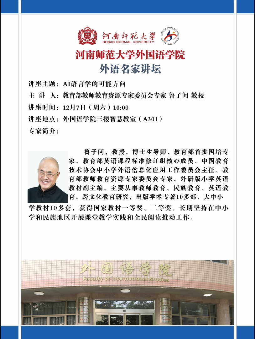 【预告】外语名家讲坛:AI语言学的可能方向 教育部教师教育资源专家委员会专家 鲁子问 教授