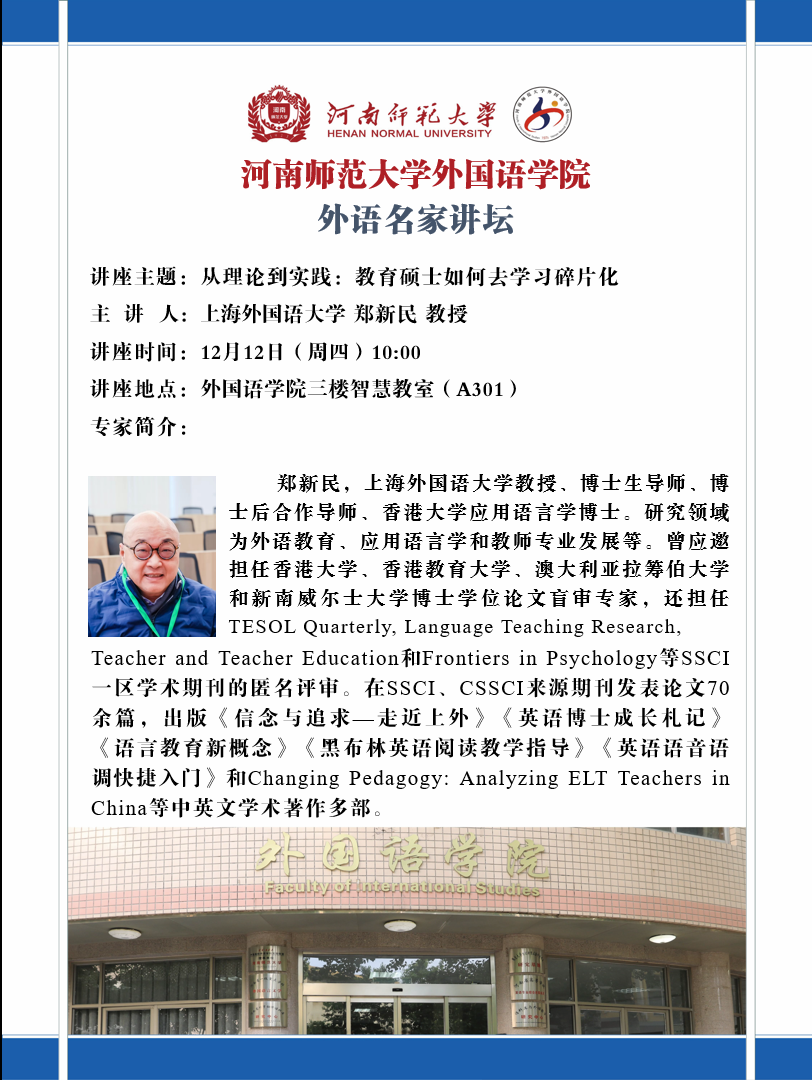 【预告】外语名家讲坛:从理论到实践:教育硕士如何去学习碎片化 上海外国语大学 郑新民 教授