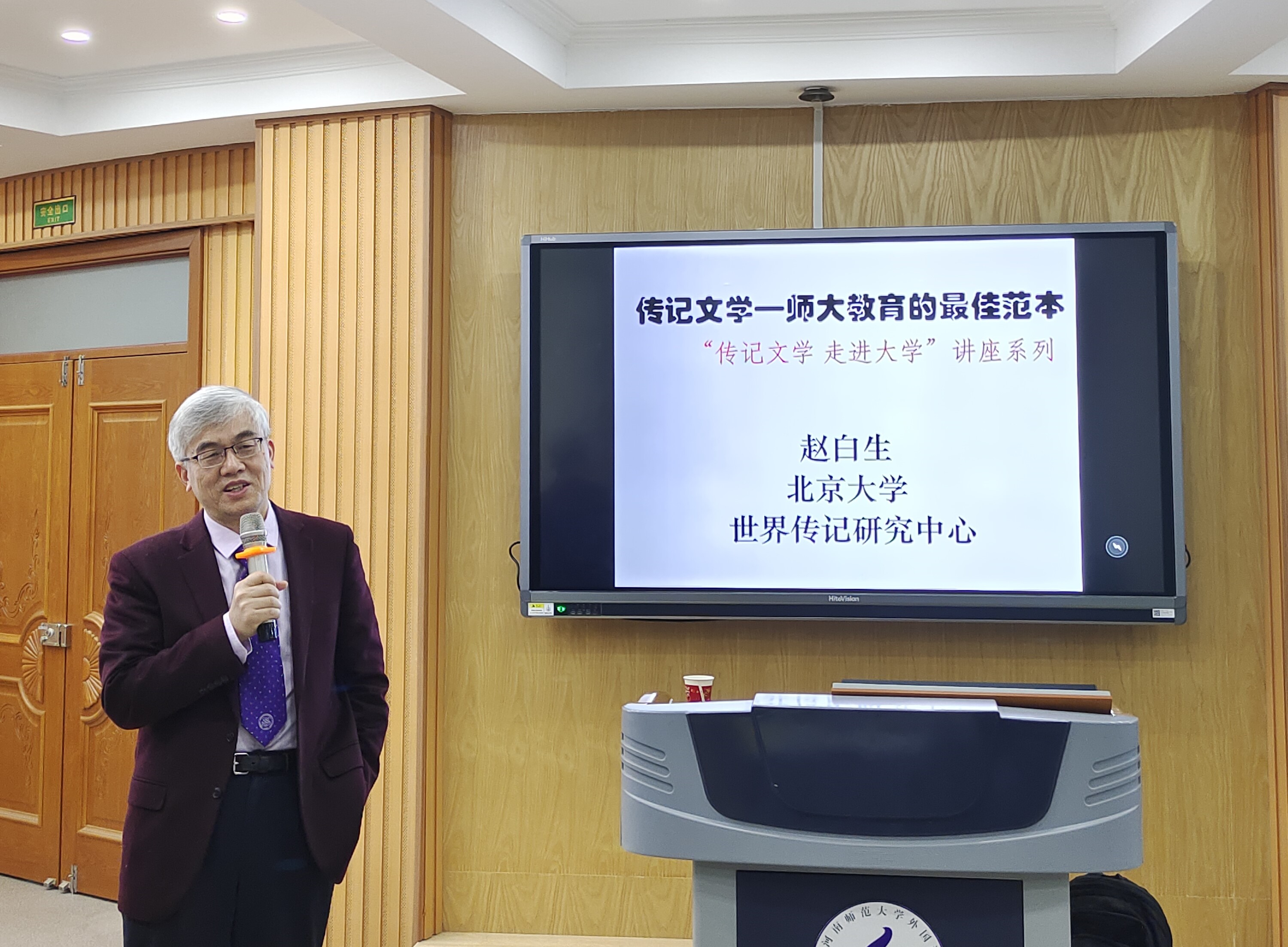 12月13日,应外国语学院邀请,北京大学赵白生教授在学院A301室作了“传记文学——师大教育的最佳范本”的学术报告,学院近百名师生参会聆听。外国语学院副院长孙士超主持报告。