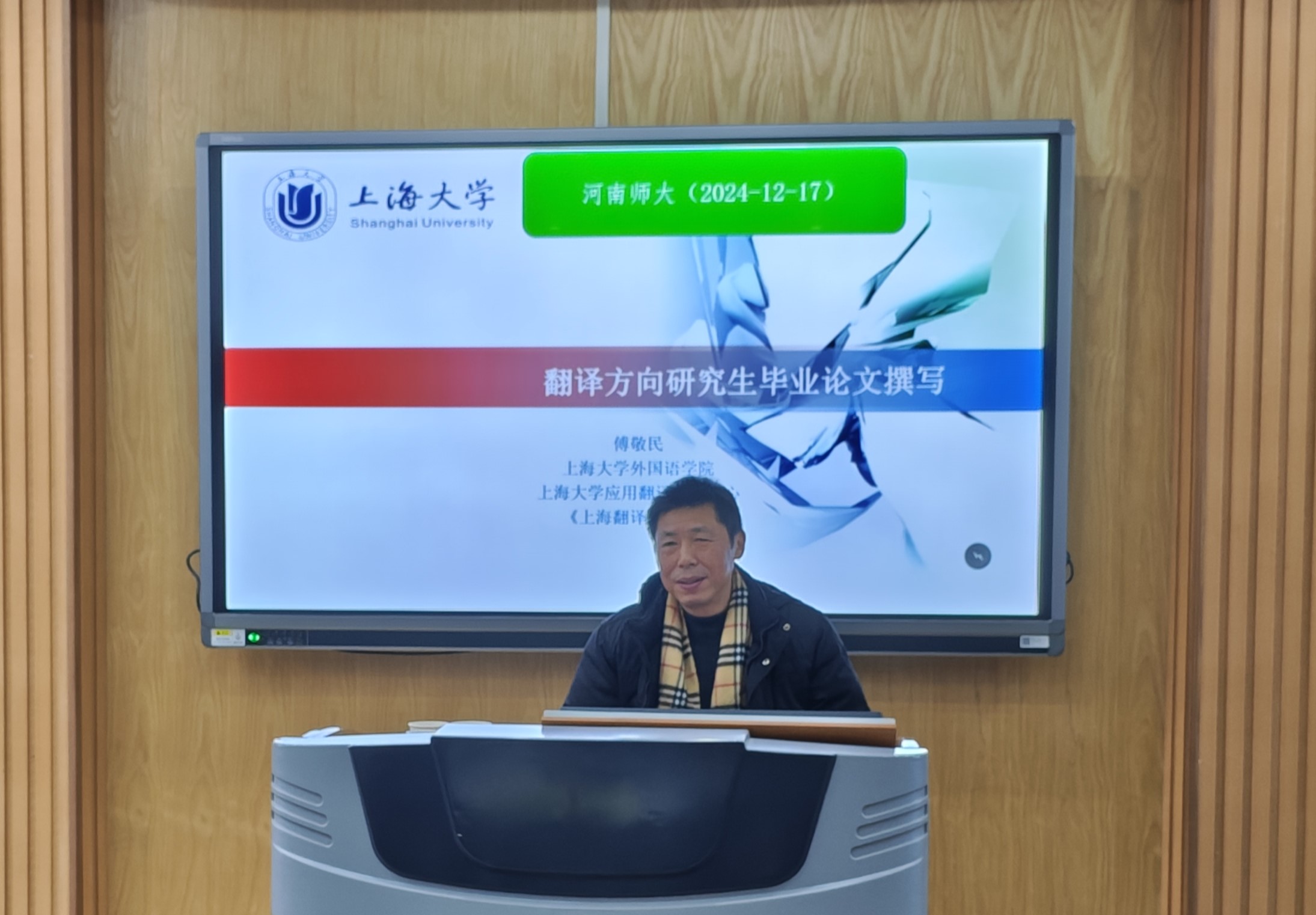 1217日,应外国语学院邀请,上海大学傅敬民教授在学院A301室作了“翻译研究前沿选题、论文写作与发表”的学术报告,学院近百名师生参会聆听。外国语学院副院长孙士超主持报告。