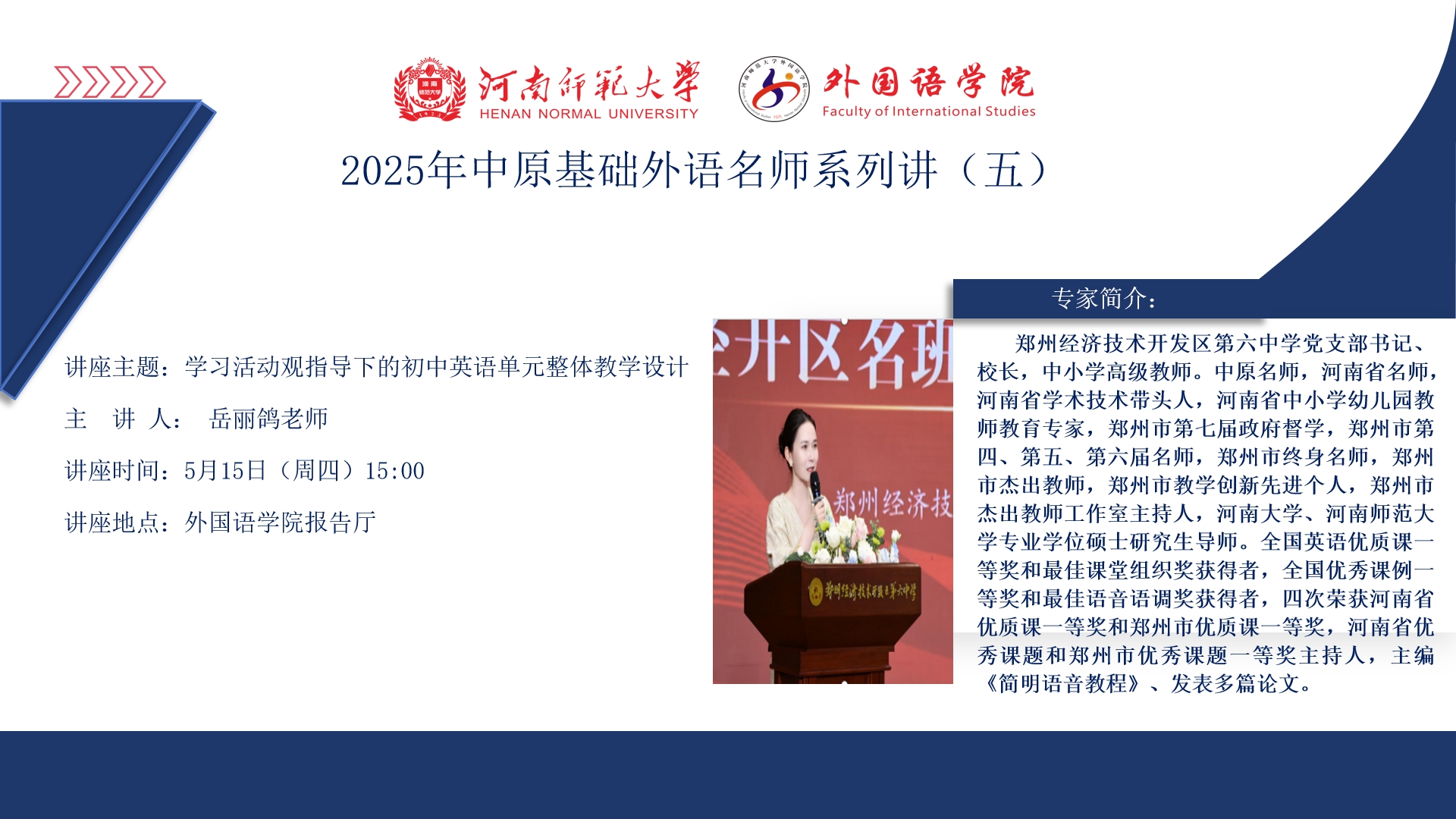 中原基础外语名师系列讲座(五):学习活动观指导下的初中英语单元整体教学设计---郑州经济技术开发区第六中学岳丽鸽老师