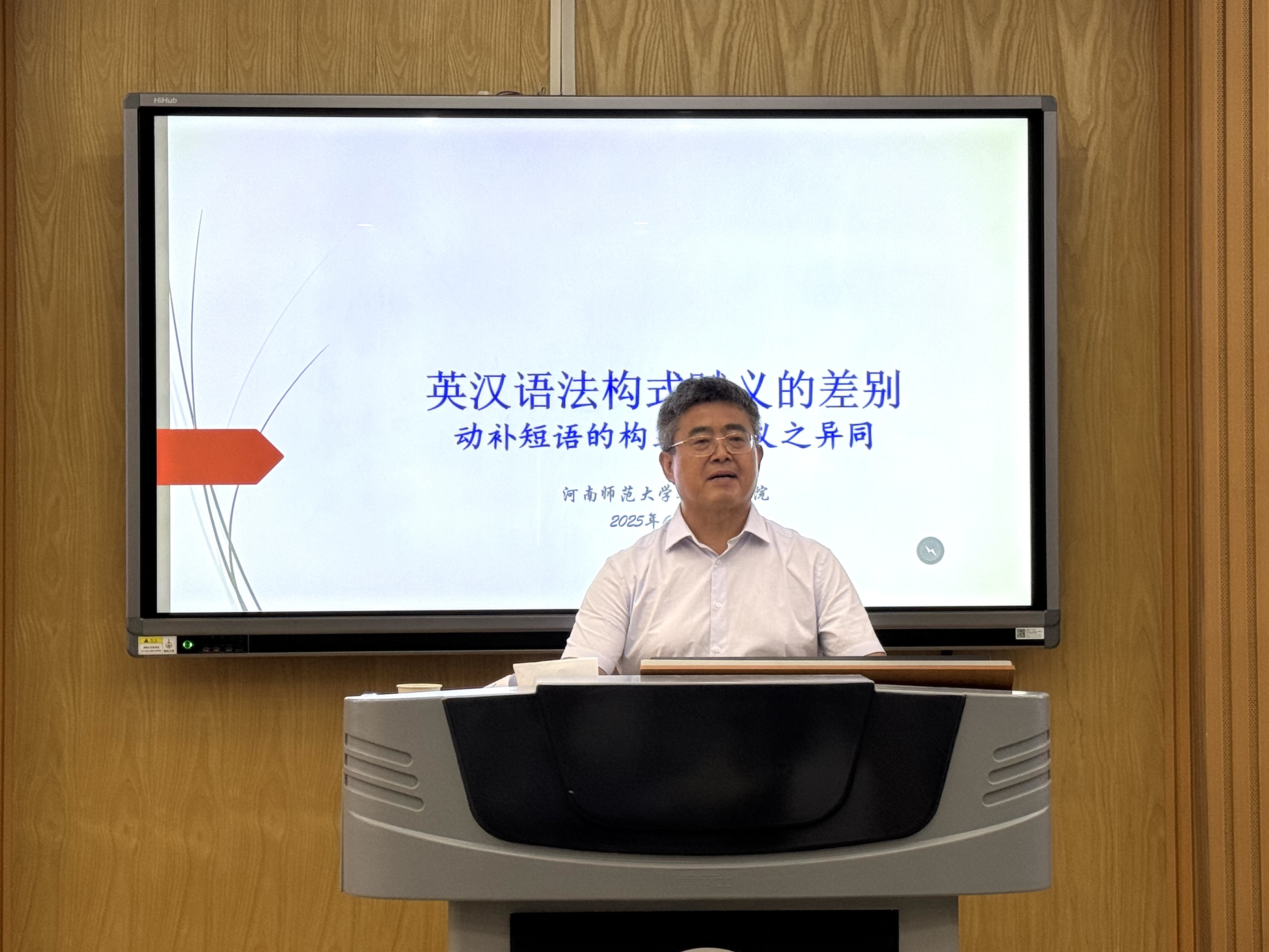在第二场报告中,石毓智分析了英汉语独有的动补短语赋予构式致使义的特征,并以英汉动补结构的这一重要属性为案例,探讨了构式语法理论的核心问题,即构式的形式和意义之间关系的复杂性。他认为,当结果补语为形容词时,英语和汉语的动补结构都具有赋予致使义的特征,然而当结果补语为介词短语时,只有英语的动补短语才能够赋予构式致使义,而汉语的则不行。报告结束后,他与参会师生进行了互动与答疑。通过此次报告,聆听者对“数学概念对自然语言的影响”和“英汉语法构式赋义的差别——动补短语的构式致使义”有了清晰的认知,拓宽了学术视野,启迪了科学思维。