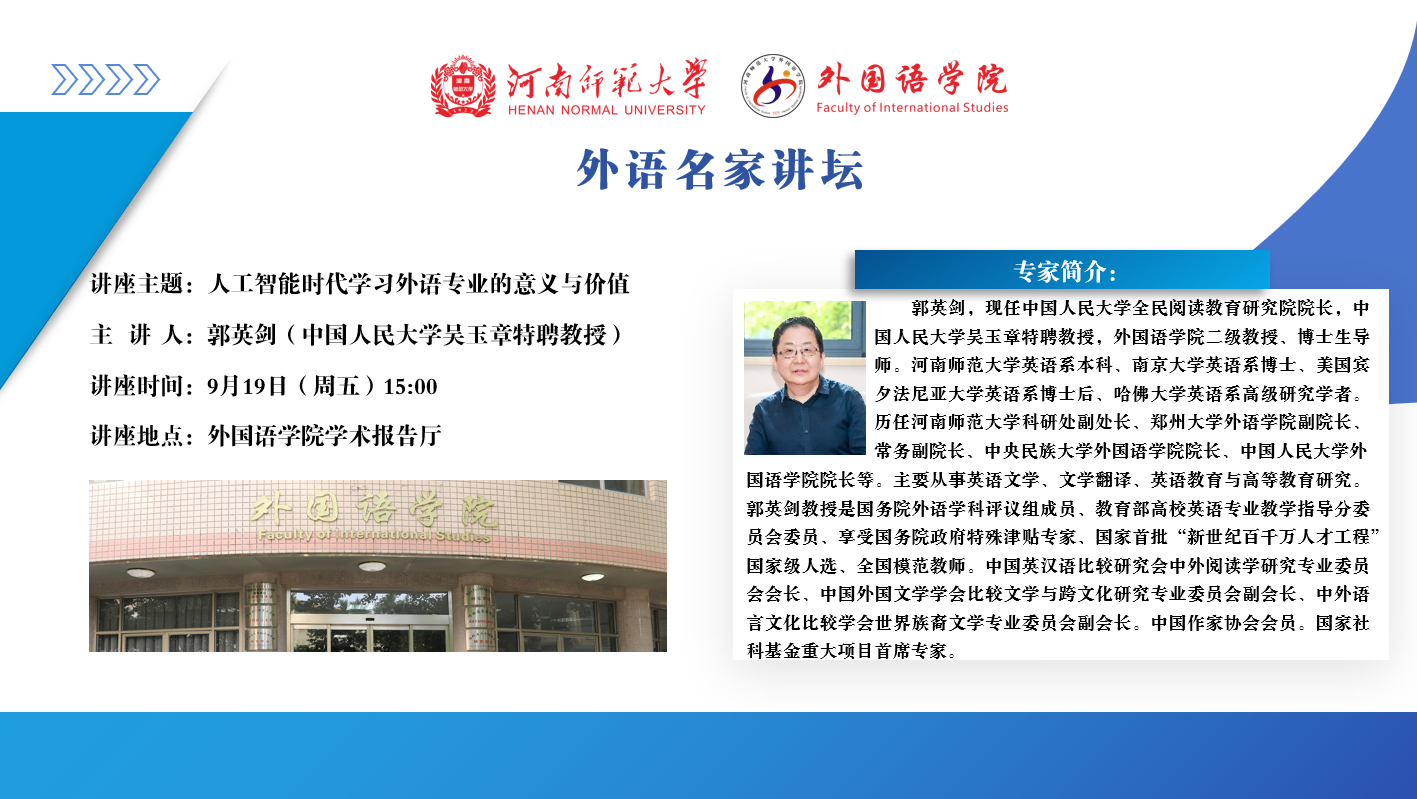 【预告】外语名家讲坛:人工智能时代学习外语专业的意义与价值 郭英剑(中国人民大学吴玉章特聘教授)