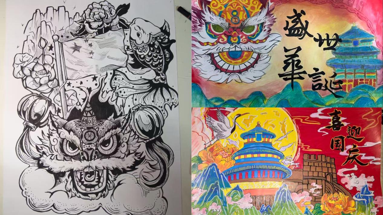本次活动通过线上线下多渠道发布征集通知,各年级学生积极响应。作品涵盖纯手绘、手绘拼贴、拼贴画等多种艺术形式,共收集作品10余份。同学们立足生活、观察时代,将国庆期间街头巷尾飘扬的鲜艳国旗、商铺门前悬挂的“祝祖国生日快乐”横幅、校园内社团组织的国庆晚会以及富有教育意义的红色主题宣讲等“盛世图景”,通过水彩的温润、马克笔的明快、拼贴的巧思等多元绘画语言,精心创作并定格于画纸之上。作品角落处,“盛世华诞”“喜迎国庆”等字样简洁有力,以青春视角生动诠释了对祖国的热爱与祝福。学院团委负责人师公祯表示,同学们以艺术为媒介,用青春视角礼赞盛世中国,让爱国情怀在笔墨色彩间得到传递与升华。