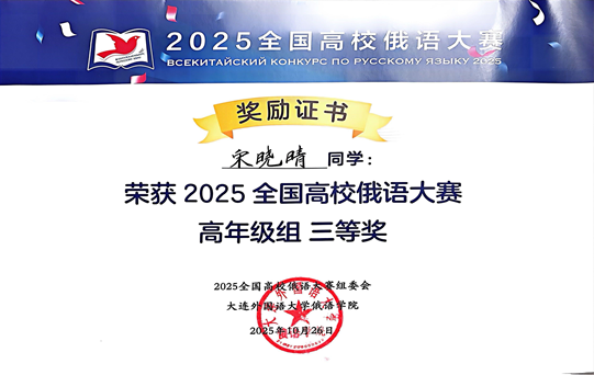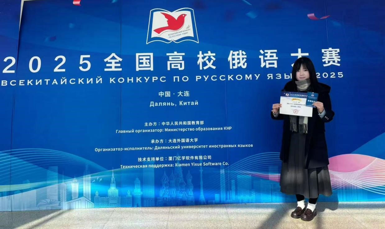 2025年10月24日至26日,由教育部主办,大连外国语大学承办的2025全国高校俄语大赛复赛和决赛在辽宁省大连圆满落幕。本次赛事吸引全国163所高校的416名学生参赛,经层层选拔,最终40余所高校的60位选手晋级复赛和决赛。我院俄语系2022级本科生宋晓晴凭借扎实的专业功底与出色的现场表现,脱颖而出,最终斩获高年级组三等奖,将获得国家留学基金管理委员会全额资助,赴俄罗斯攻读硕士学位机会。