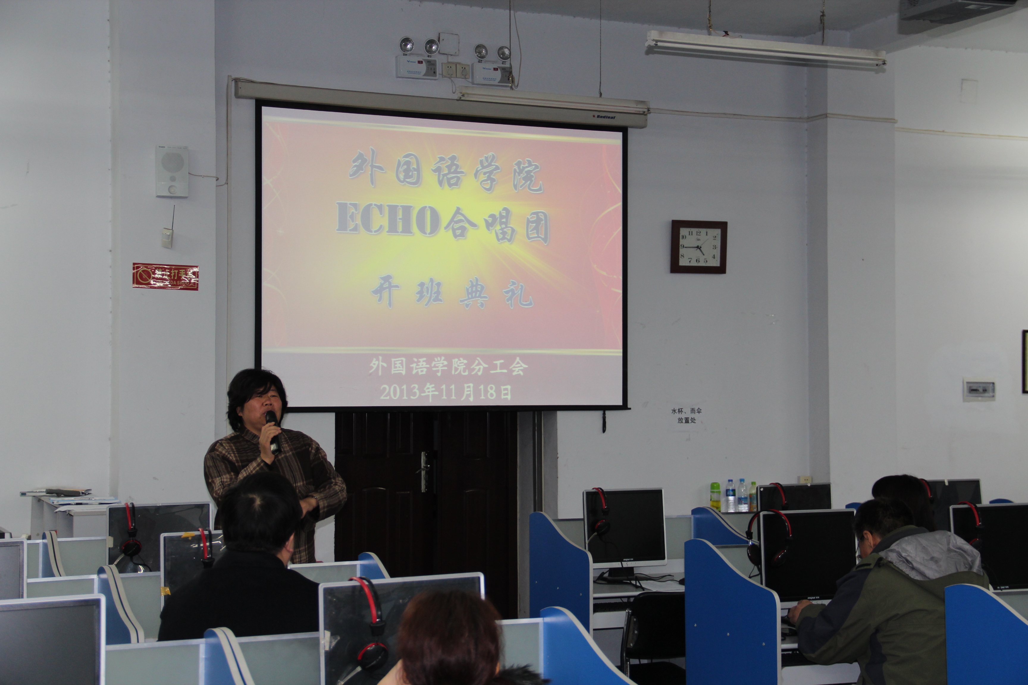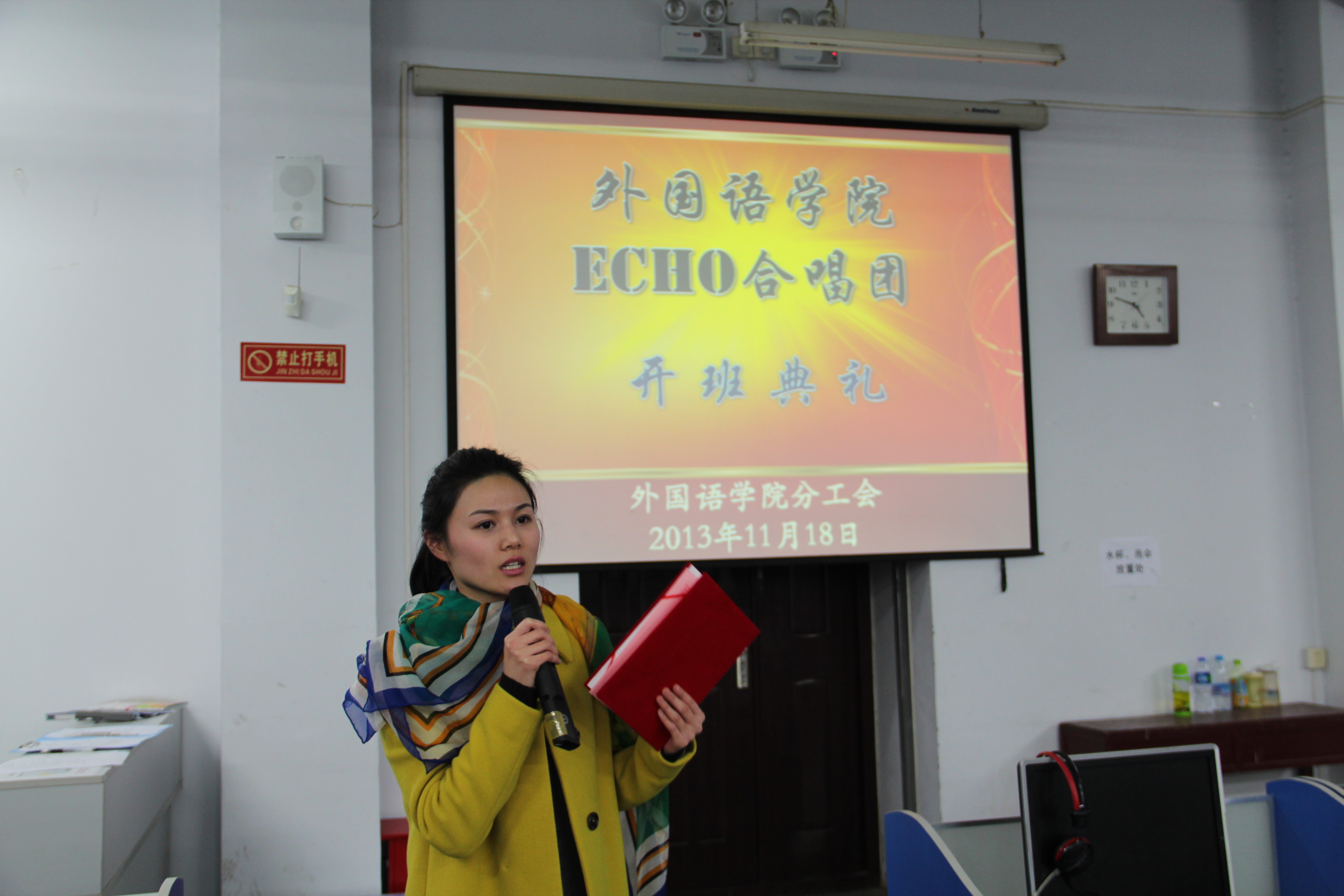 为了丰富我院教职工的业余文化生活,提高艺术素养和审美情趣,在外国语学院领导的大力支持下,我院工会特成立教工“ECHO”合唱团,让大家在繁忙的工作之外放松心情,陶冶情操,在美的熏陶下愉快地工作、生活。合唱团聘请我院唐新老师担任艺术指导,定期组织排练。外国语学院宋霞书记和贾建嵩副院长分别致辞祝贺,并表示了对合唱团美好未来的憧憬和期望。