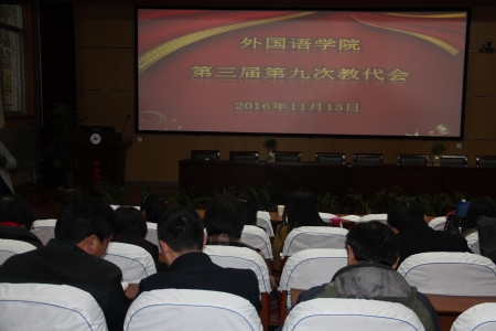 11月15日下午,外国语学院第三届九次教代会在学院报告厅举行。本次会议应到代表31名,实到26名,因公因事请假5名,符合法定人数。会议由院工会副主席王晔主持。