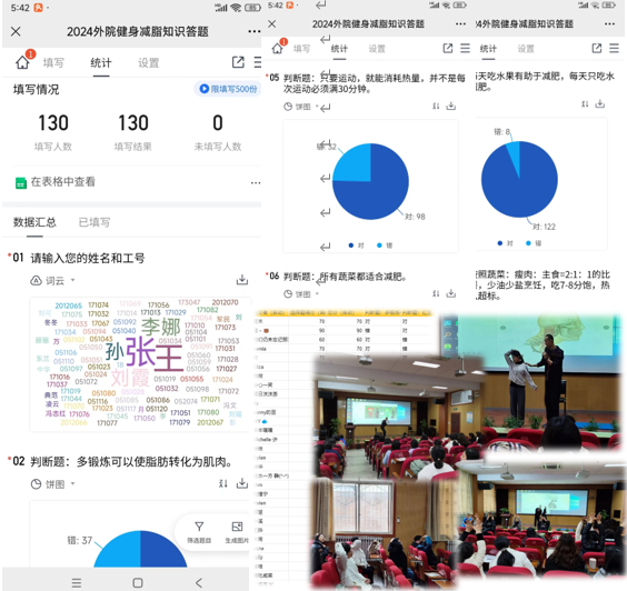 作为本次活动的重点,院工会又举办了线上答题竞赛,本次竞赛题目设计旨在普及健康知识,传播健康理念,增强教职工的健身意识,提高教职工的自我保健能力。竞赛题目涵盖睡眠时间、运动频率、饮食健康等日常健康知识,也包括肩颈健康、疼痛管理、血压控制等疾病防治要点。看似简单的竞赛题目,其实藏着丰富的健康知识。参赛教师们一面沉着答题,一边在群内沟通交流,气氛轻松愉悦。本次竞答自三月八日启动至十五日结束,广泛发动全院教职工积极参与,共计130名老师参与了答题。