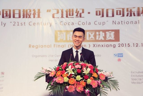 徐博闻,入学以来,先后担任2013级年级长、外国语学院学生会主席,成绩优异,全面发展。综合测评连续两年位居翻译专业第一名,学业成绩位居翻译专业前三名;曾获得“2013—2014学年度国家奖学金”、“2014—2015学年度国家励志奖学金”,获得“河南省优秀学生干部”、“新乡市文明学生”、“优秀共产党员”、“三好学生标兵”等荣誉称号。参加第二十一届中国日报社“21世纪•可口可乐杯”全国英语演讲比赛获得河南赛区亚军及全国三等奖;获得伟德官网下载苹果版第七届讲课说课大赛讲课组一等奖,第二十一届双语演讲赛英文专业组一等奖,“诚信校园行”大学生辩论赛获团体一等奖等。