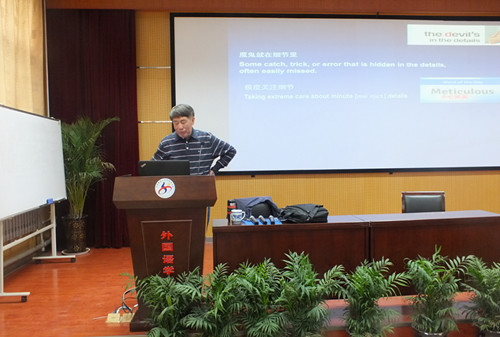 5月7日上午外国语学院特邀资深新闻工作者、新华社高级编辑、全国翻译资格考试英语专家组成员、全国翻译系列高级职称评审委员会委员吴月辉老师,在外国语学院报告厅开展以“魔鬼就在细节――CATTI英译汉考点探微”为主题的讲座。翻译系主任郭英珍主持,数名老师及百余名学生聆听本次讲座。