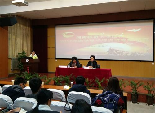 为引导团学干部筑牢思想根基、强化宗旨意识和践行群众路线,建设更加坚强有力的共青团组织,12月25日上午,外国语学院于学院学术报告厅举办团学骨干培训班专题讲座。讲座由外国语学院党委书记宋霞主持,特邀新乡市茹岗社区党委书记、中共十八大省、市代表张春兰担任主讲嘉宾。外国语学院团委书记唐新、党委秘书刘静观、环境学院团委书记董长雨、外国语学院各支部书记出席本会,近200名团学骨干认真聆听。