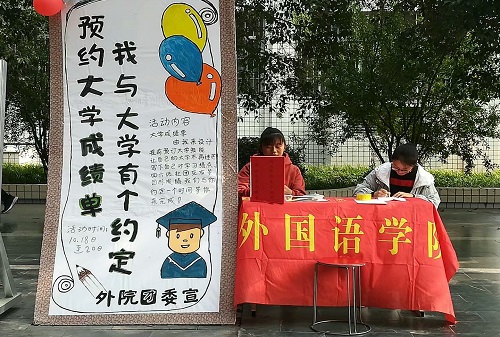 为继承发扬师大心怀梦想、勤奋学习的优良传统,深入贯彻常俊标校长“融入师大 成就梦想”的讲话内容,10月7日至9日,外国语学院于万人餐厅门口开设摊位,面向全校学生,组织开展“预约成绩单—我和大学有个约定”特色主题活动。
