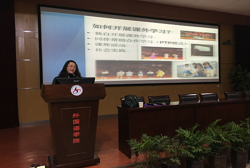 12月13日晚,外国语学院2016级于学术报告厅举行“外语专业学生如何开展课外学习”讲座。本次讲座由外国语学院院长梁晓冬担任主讲人,2016级辅导员安璐、英语、翻译专业近200名学生参加讲座,共同学习。