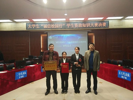 3月12日晚7点,由校学生处主办的“诚信校园行”学生资助知识大赛决赛暨颁奖仪式在东区模拟法庭进行。我院杨轲晴、张畅、黄笑三名学生荣获亚军,其中选手杨轲晴获最佳选手奖,外国语学院荣获优秀组织奖。