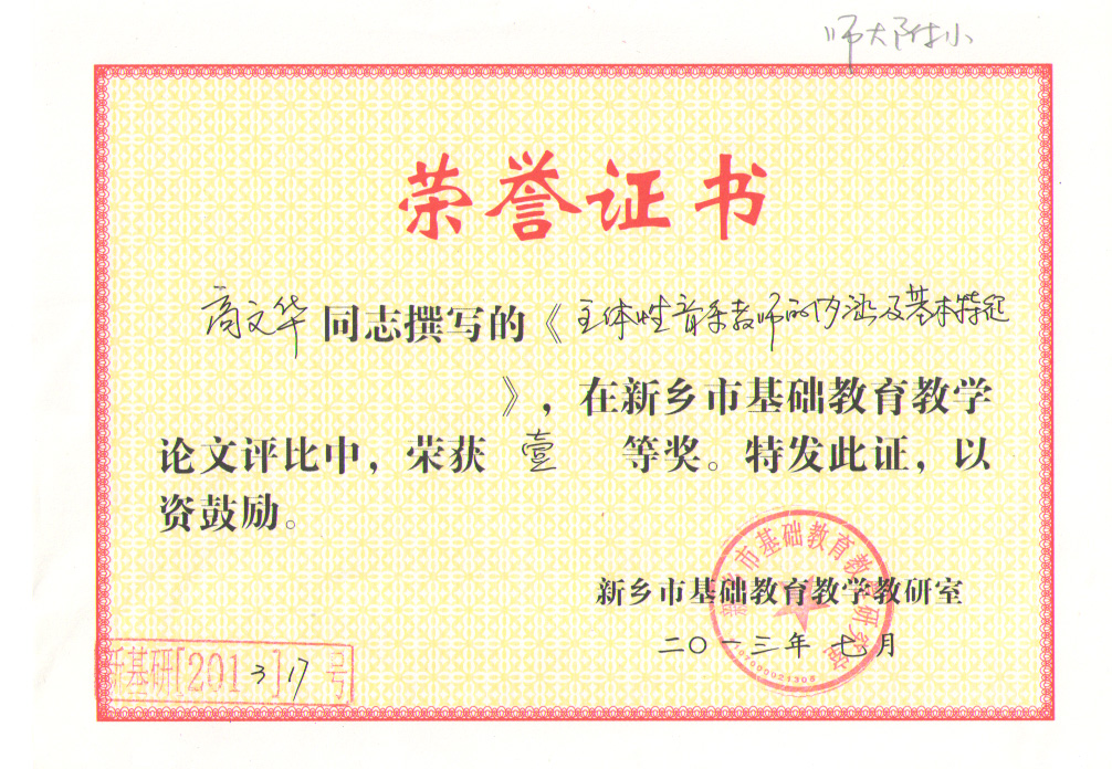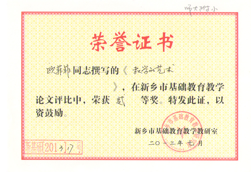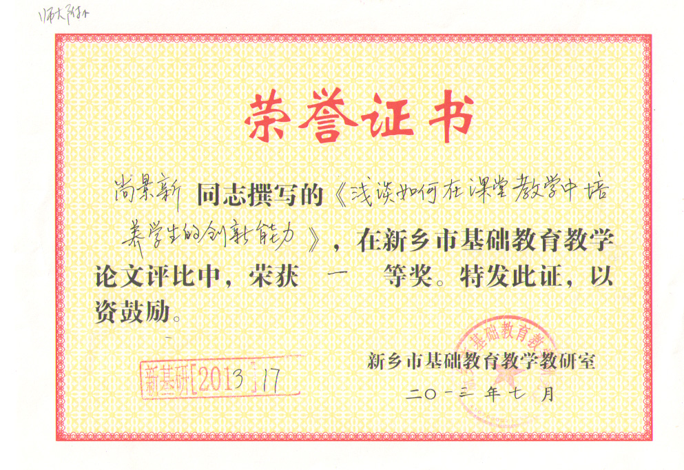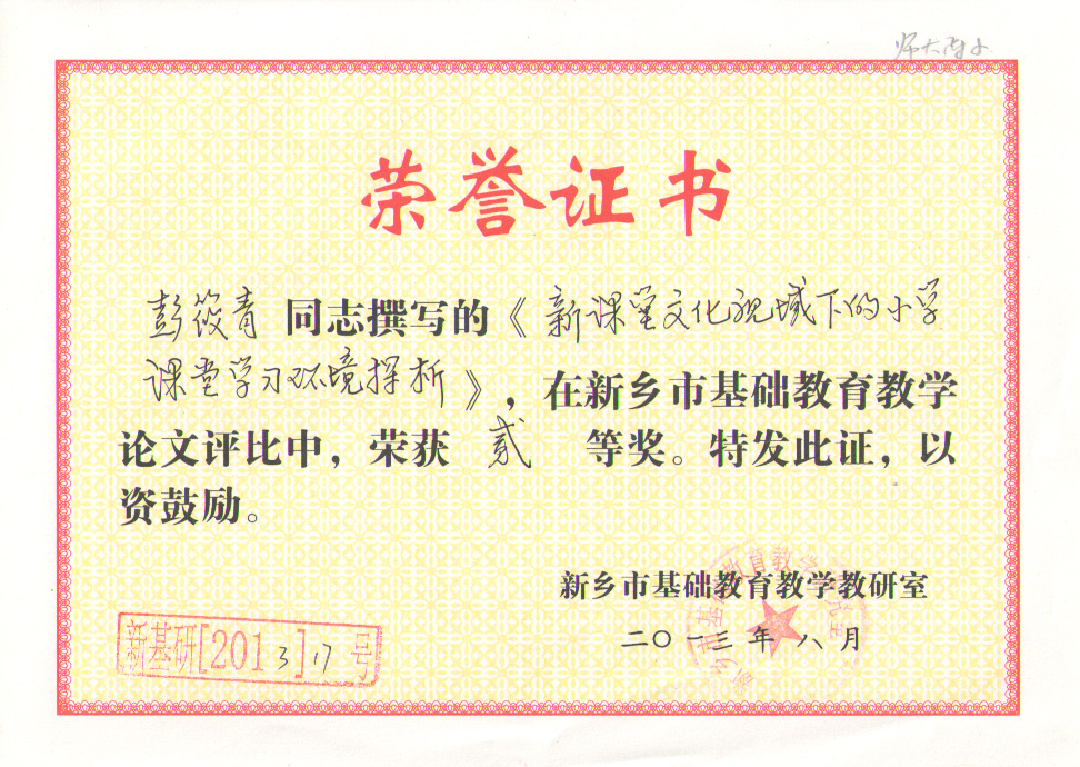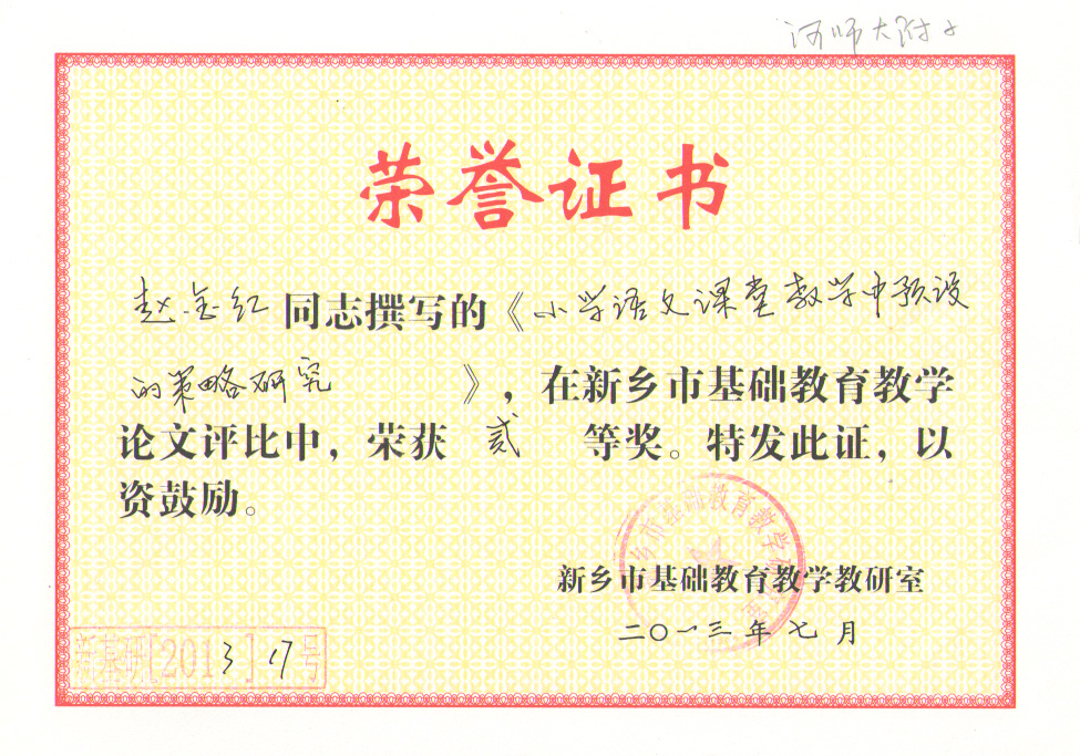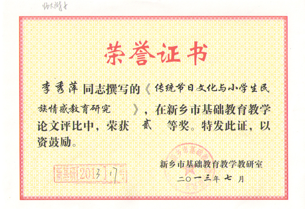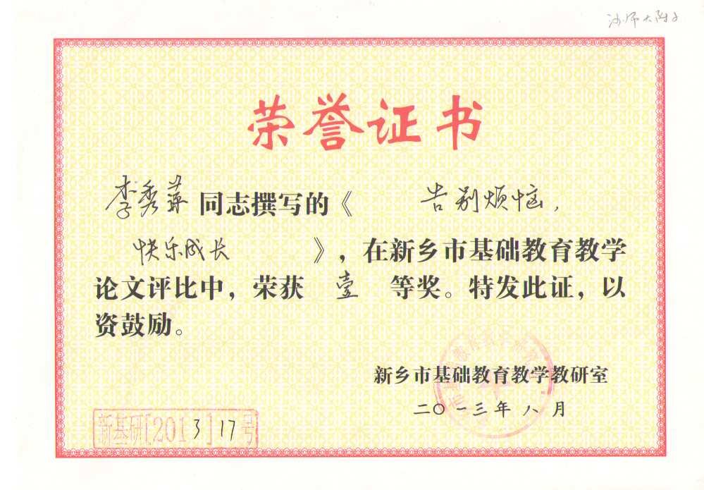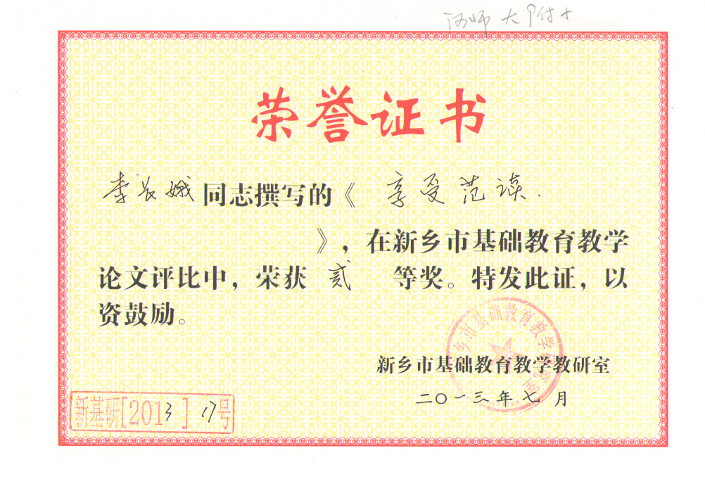 2013年7月,在新乡市基础教育教学论文评比活动中,李秀萍、高文华、尚景新等3位老师获一等奖,赵金红、欧菲菲、李秀萍、李长娥、彭筱青等5位老师获二等奖。