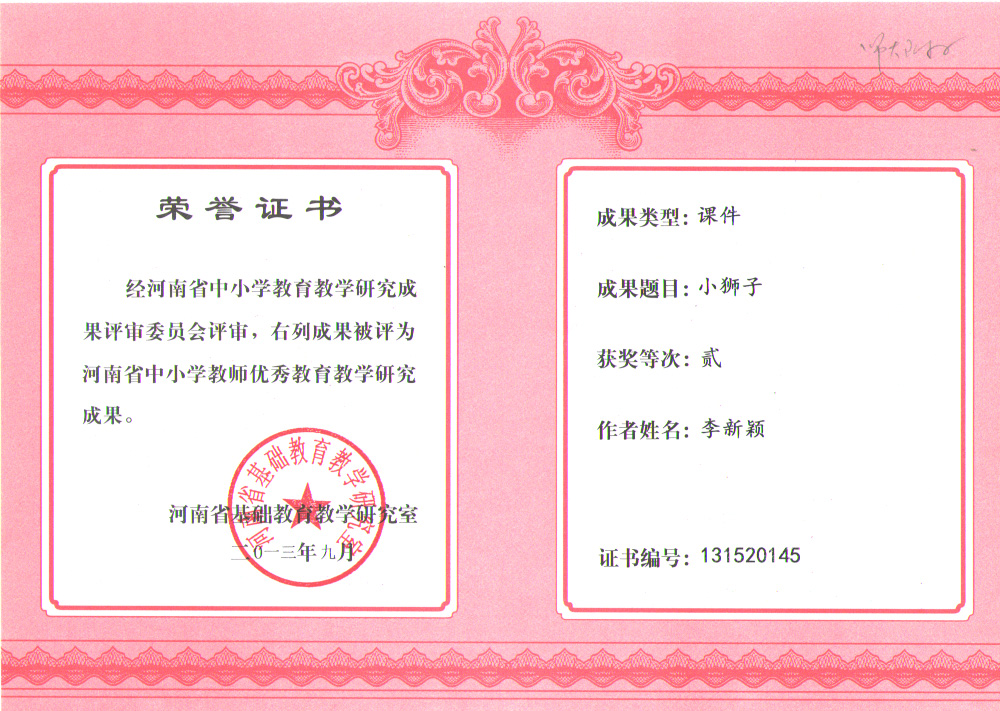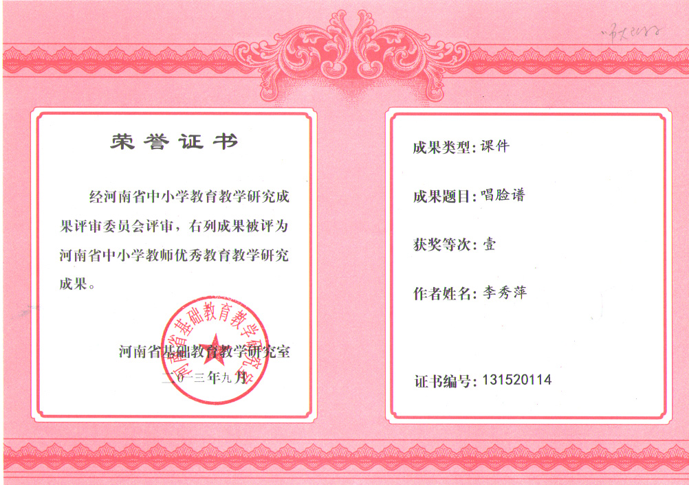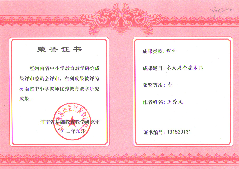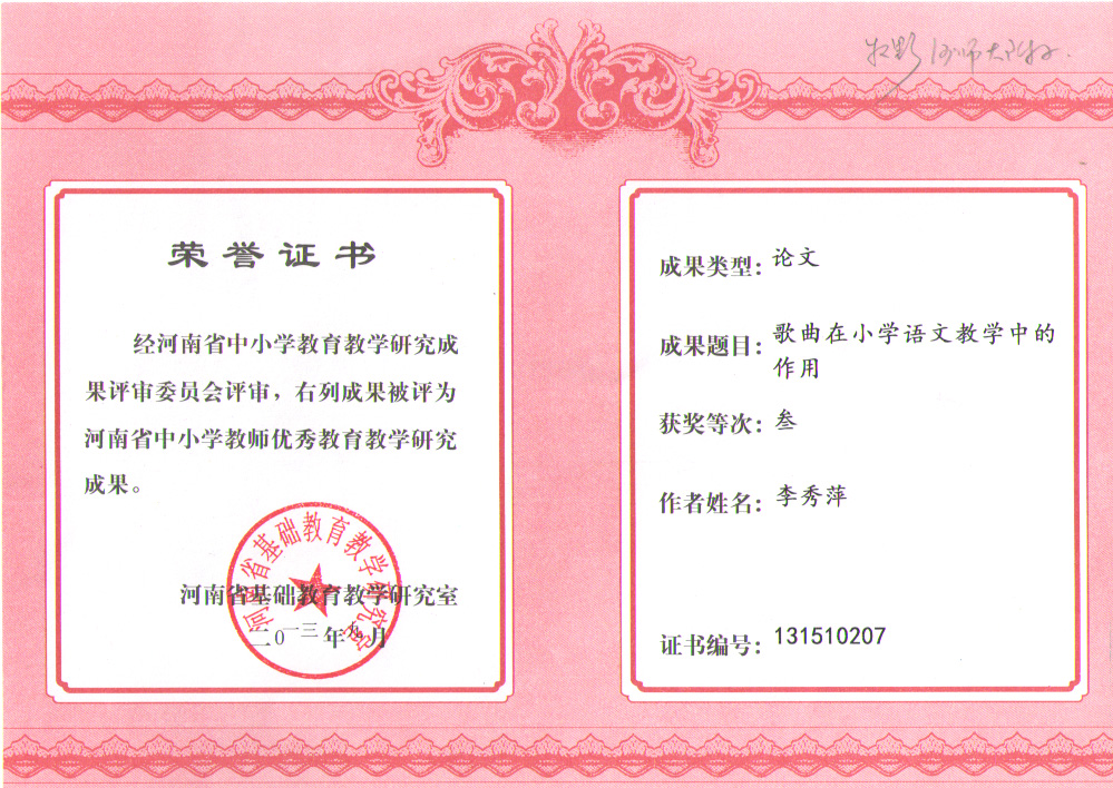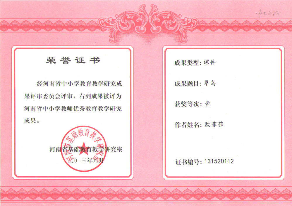 2013年9月,在河南省中小学教师优秀教育教学研究成果评比活动中,共有12位教师获奖。其中,李秀萍、王秀凤、欧菲菲、王凌莉等4位老师的研究成果获一等奖,赵金红、彭筱青、赵静、魏贝贝、李长娥、王利敏、李新颖等7位老师获二等奖,李秀萍老师获三等奖。