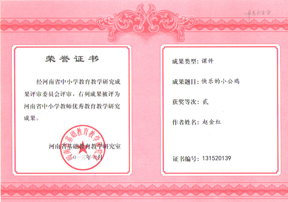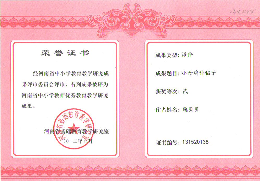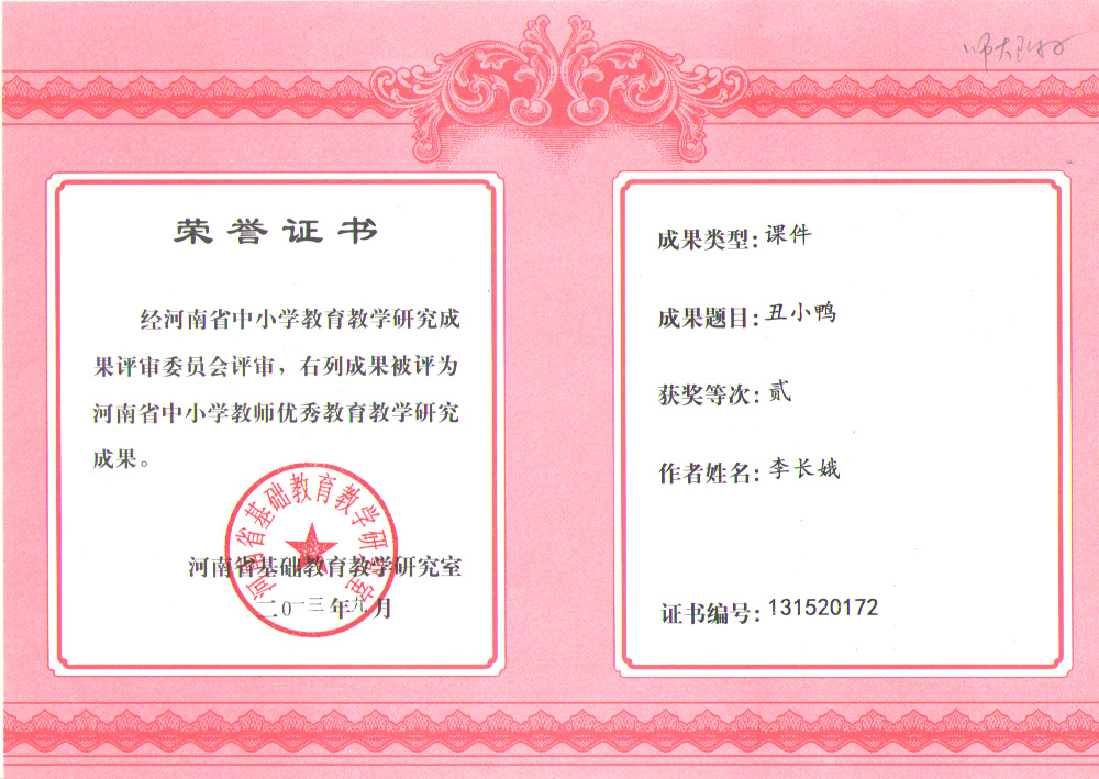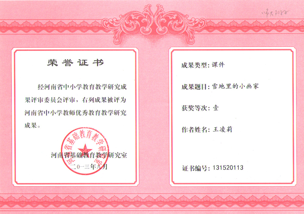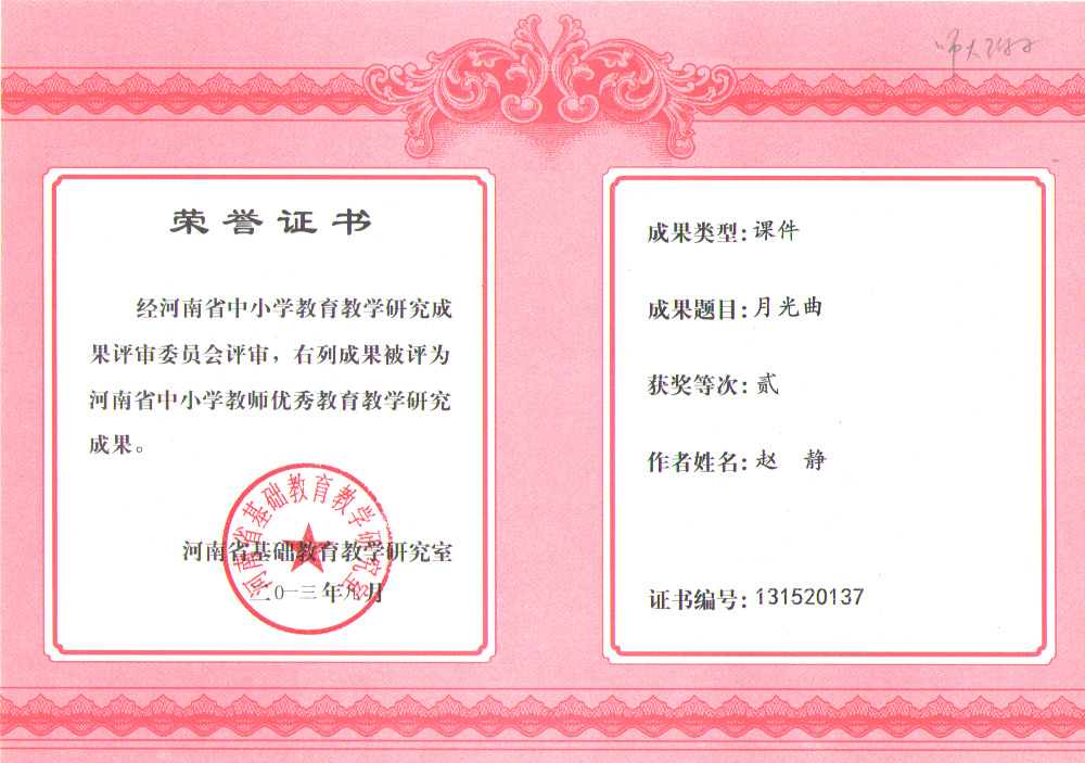 2013年9月,在河南省中小学教师优秀教育教学研究成果评比活动中,共有12位教师获奖。其中,李秀萍、王秀凤、欧菲菲、王凌莉等4位老师的研究成果获一等奖,赵金红、彭筱青、赵静、魏贝贝、李长娥、王利敏、李新颖等7位老师获二等奖,李秀萍老师获三等奖。