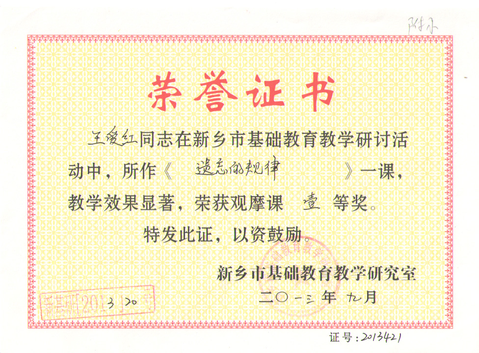 月,王爱红同志在新乡市基础教育教学研讨活动中,所作《遗忘的规律》一课,教学效果显著,荣获观摩课一等奖。