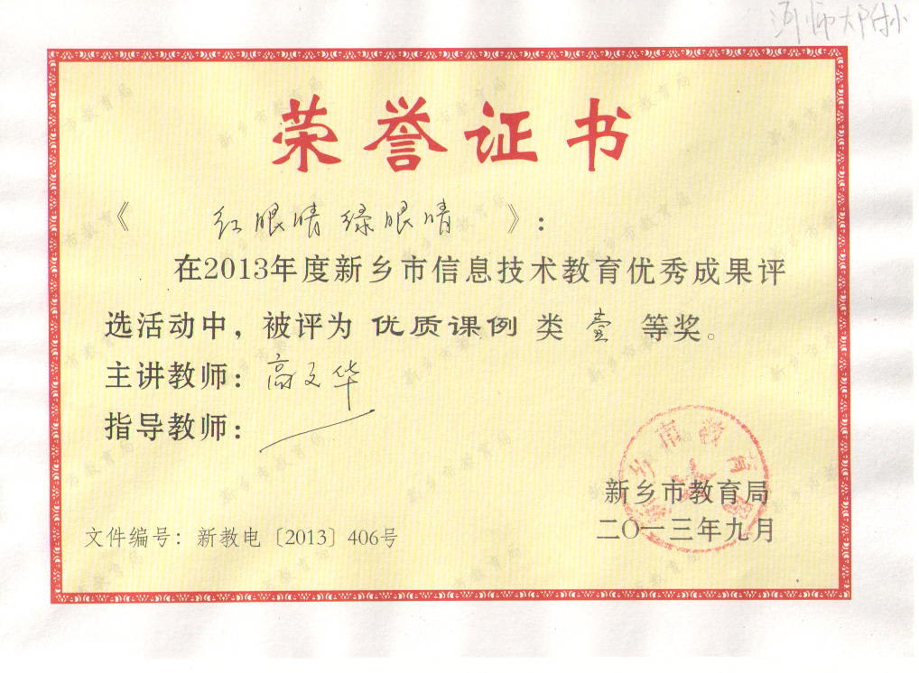 2013年9月,在2013年度新乡市信息技术教育优秀成果评选活动中,高文华老师执教的《红眼睛 绿眼睛》一课,获优质课例类一等奖。