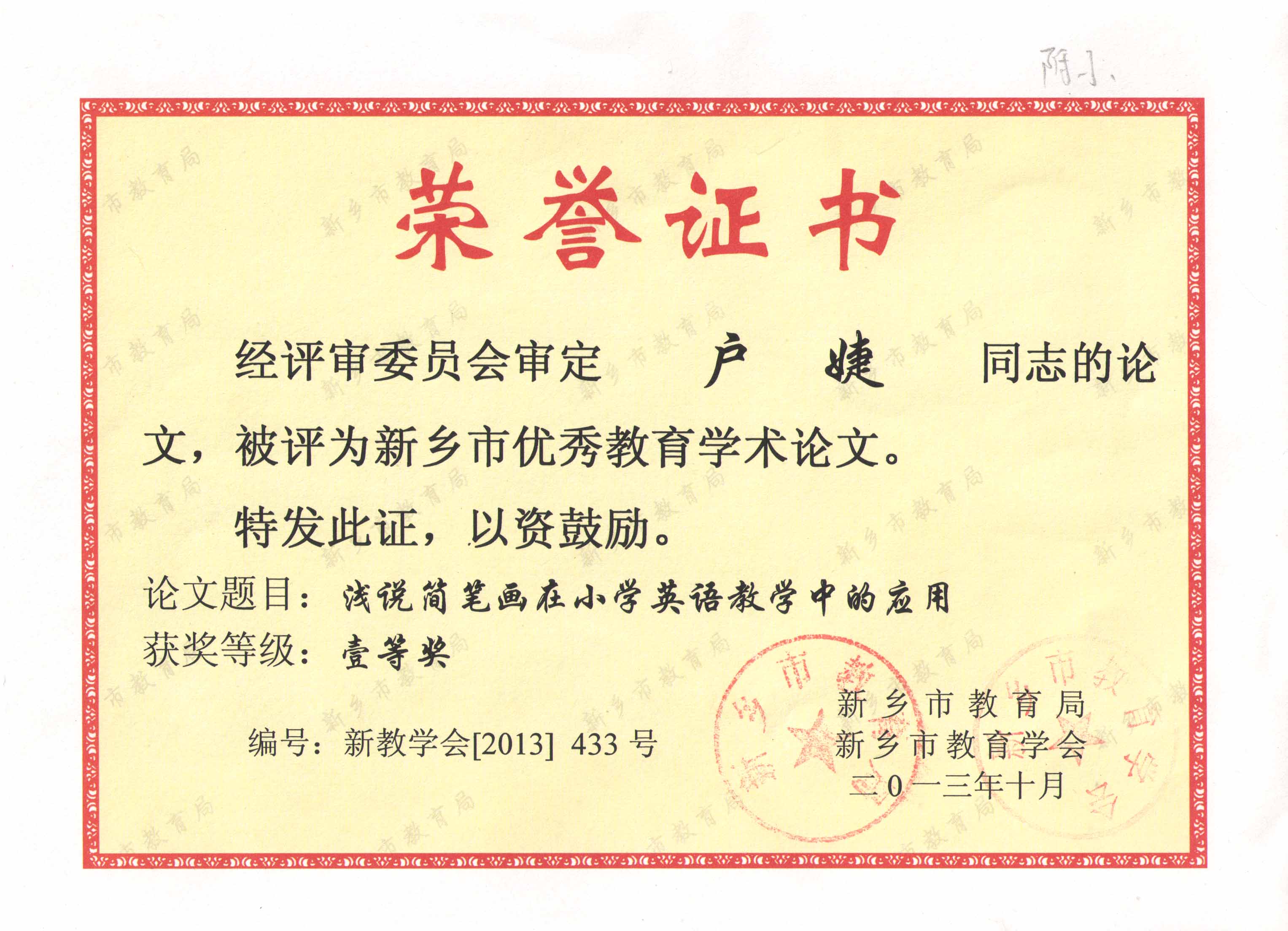 月,在新乡市优秀教育学术论文评比中,户婕、李秀萍获一等奖,彭筱青、尚景新老师获二等奖。