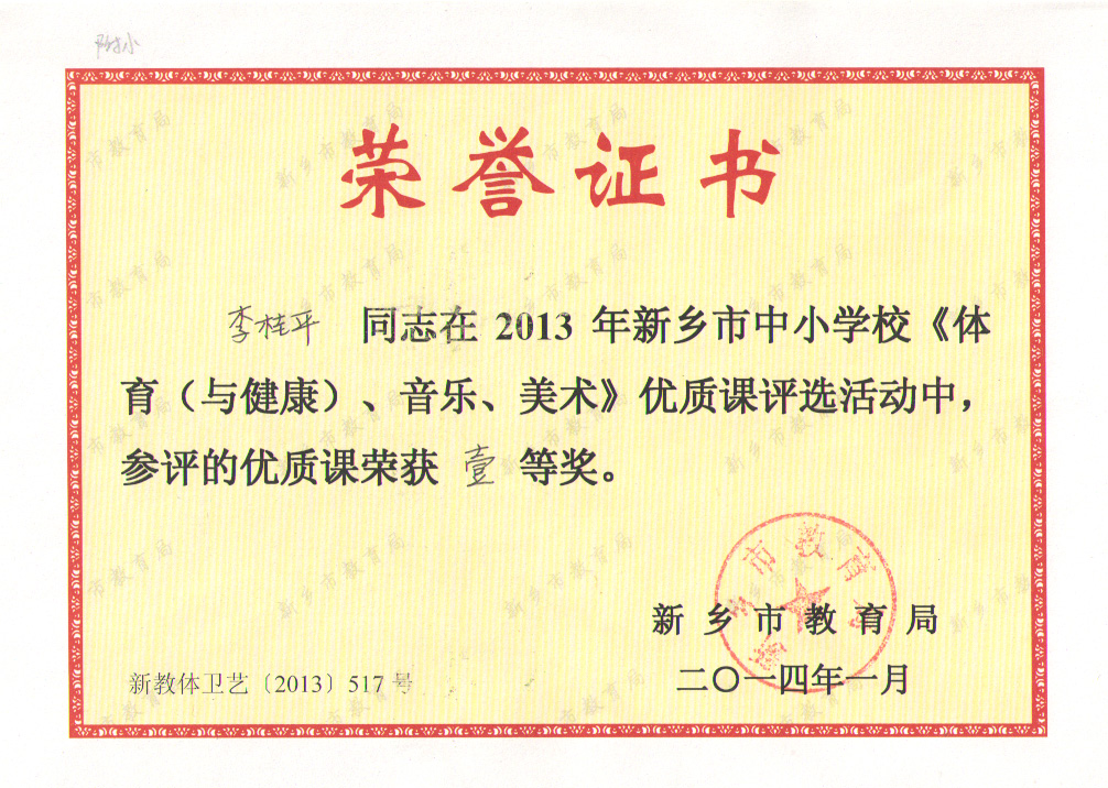 在新乡市教育局于2013年11月-12月份开展的全市中小学体育与健康、音乐、美术优质课评选活动中,李桂平老师执教的美术课《百变团花,装扮生活》,获一等奖。