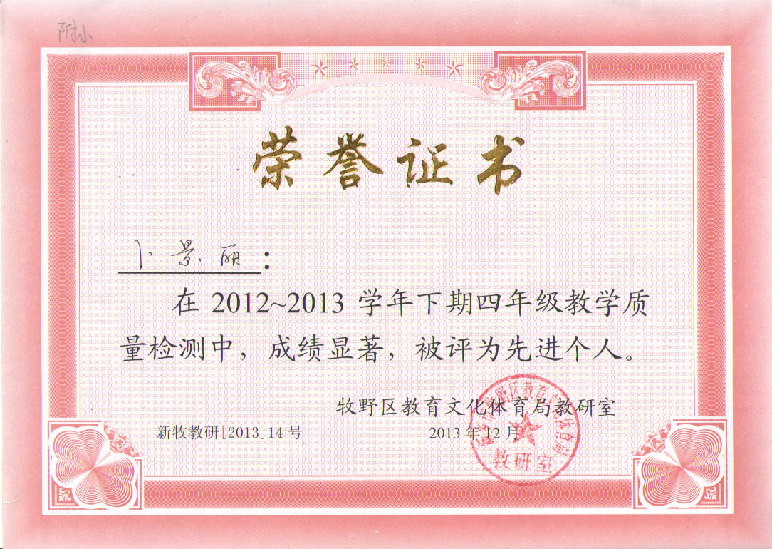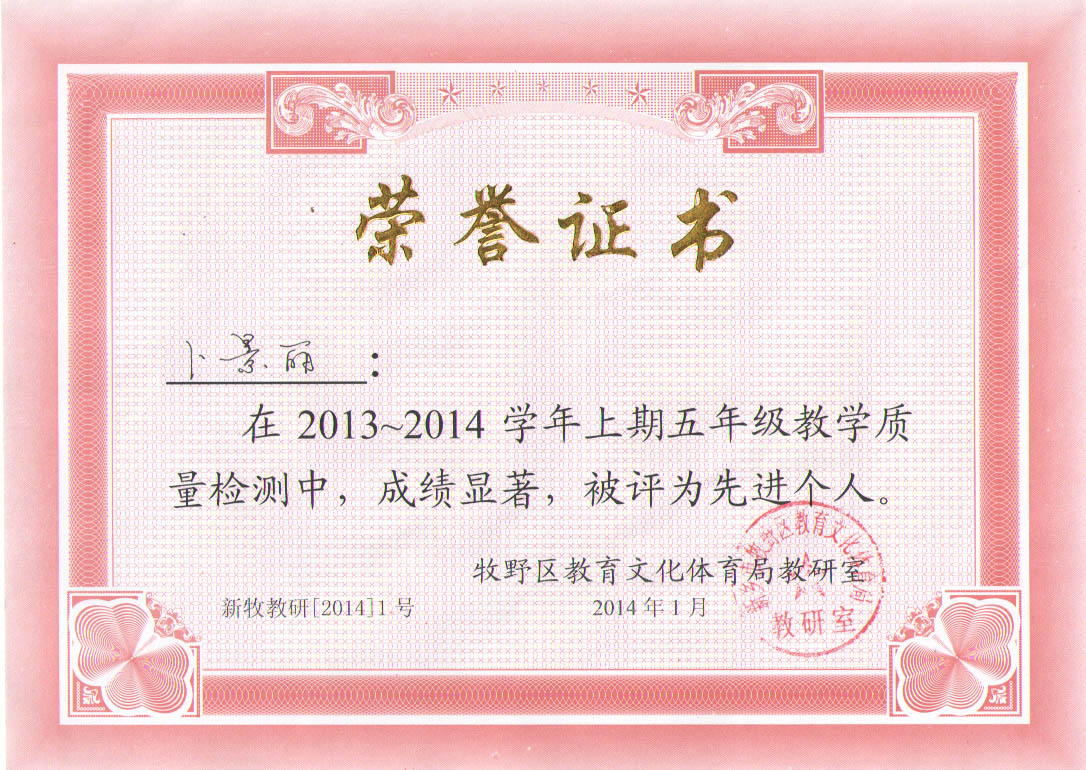 2013年,在牧野区教育文化体育局组织的2012-2013学年下期四年级和2013-2014学年上期五年级教学质量检测中,卜景丽、尚景新老师辅导的学生成绩突出,被评为牧野区教学质量先进个人。