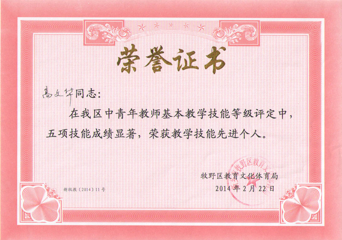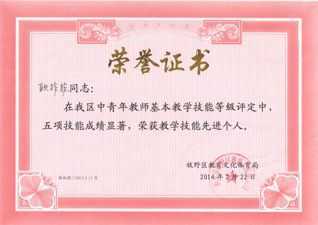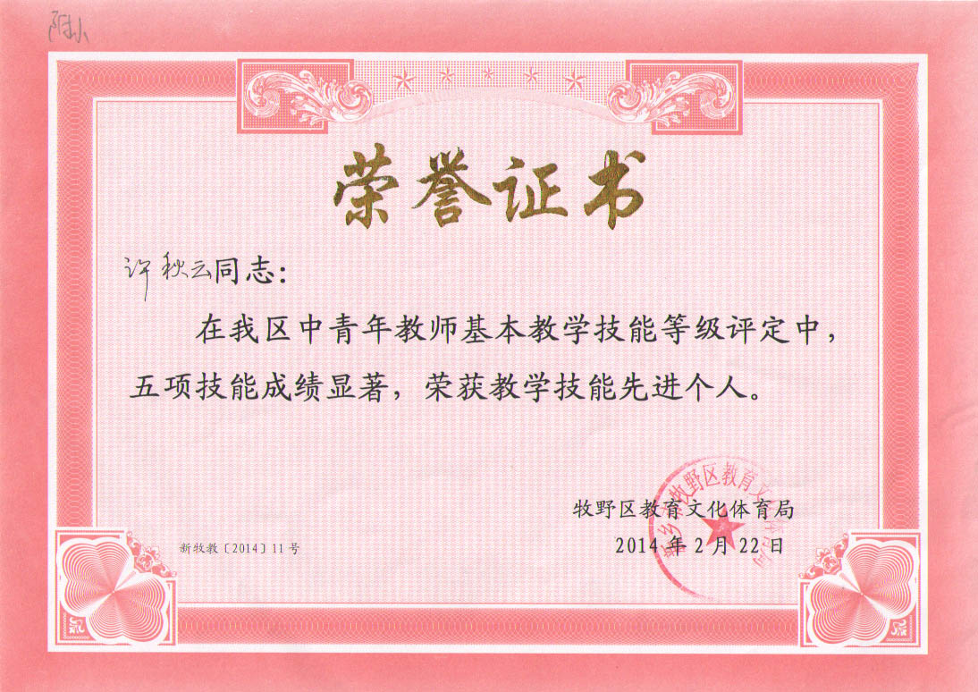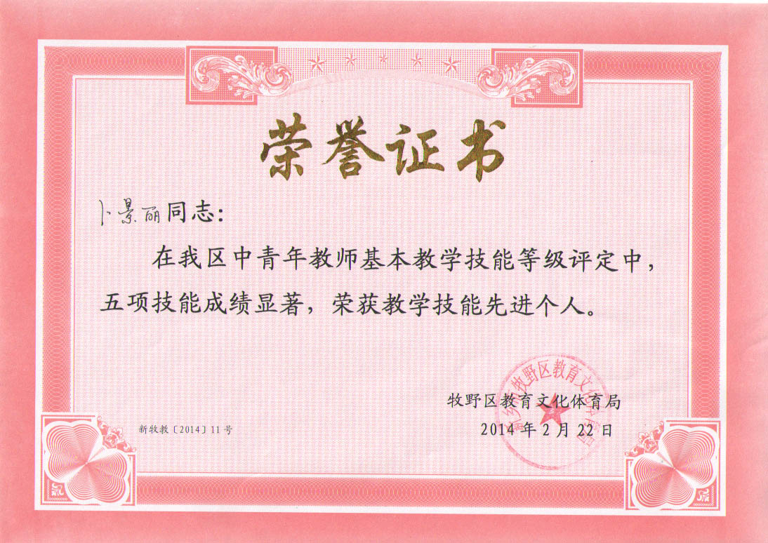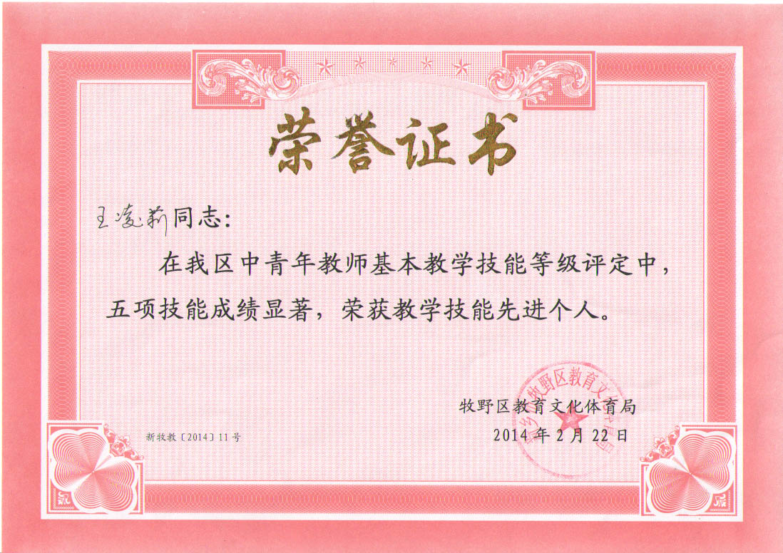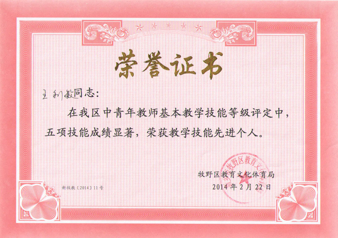 2013年,为了加强教师队伍建设,牧野区开展了中青年教师基本教学技能等级评定工作,进行了微型课、汉字书写、课程和课标及教材解读等五项教学技能测评。王利敏、卜景丽、高文华、欧菲菲、王凌莉、魏贝贝、许秋云等7位老师成绩显著,荣获牧野区教学技能先进个人荣誉称号。希望受表彰的老师珍惜荣誉,再接再厉,充分发挥模范带头作用。