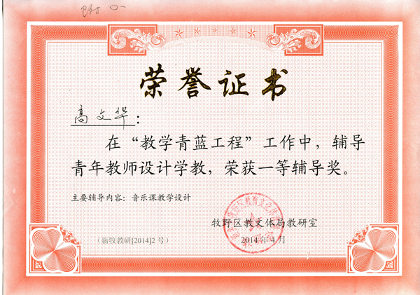 本学期牧野区教研室开展了“教学青蓝工程”系列工作,我校教师高文华辅导青年教师设计学教,并就如何进行音乐课教学设计进行专题讲座,荣获一等辅导奖。
