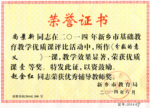 我校程乔夏书记执教的语文课《西门豹治邺》、尚景新老师执教的数学课《分数的意义》均荣获新乡市优质课一等奖。