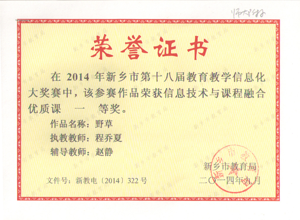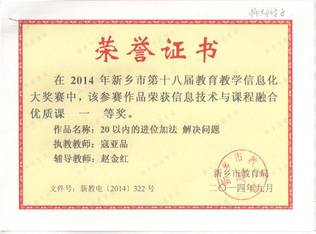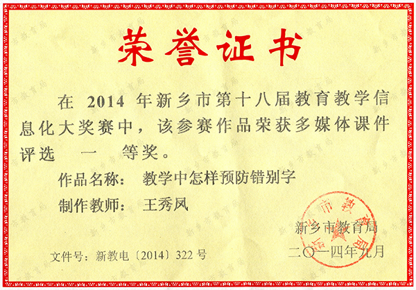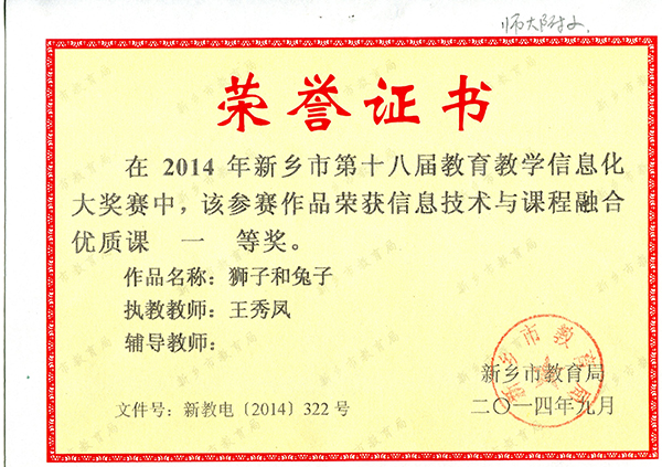 附属小学积极参加2014年新乡市第十八届教育教学信息化大奖赛,取得了突出成绩,获信息技术与课程融合优质课一等奖2项,获多媒体课件一等奖1项。