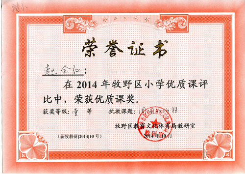 在牧野区2014年小学优质课评比活动中,我校赵金红老师执教的语文课《圆圆的沙粒》获得一等奖,并将代表牧野区参加市优质课比赛;李静静老师执教的数学课《观察物体》获得二等奖。