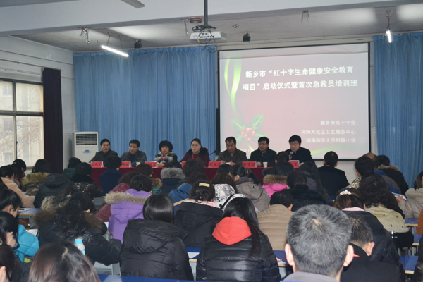 启动仪式由新乡市红十字会秘书长刘继英主持。副会长马云对该项目“小手拉大手,健康一起走”活动主题的目的意义、内容与实施等作了详细讲解和总体部署。河师大社区卫生服务中心副院长朱命祺和附小校长李万里对本单位情况和如何协力进行这项工作都作了重要发言。参加启动仪式和培训的有新乡市红十字会、河师大社区卫生服务中心和附小全体教师共一百多人。