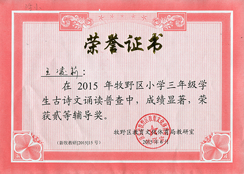 在2015年牧野区小学古诗文诵读普查中,三年级荣获二等奖,王凌莉老师荣获二等辅导奖。