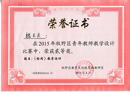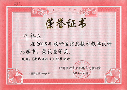 在2015年4月,牧野区教研室组织的教学设计比赛中,我校许秋云老师《制作课程表》获一等奖;李静静的《混合运算》、魏贝贝的《检阅》获二等奖。