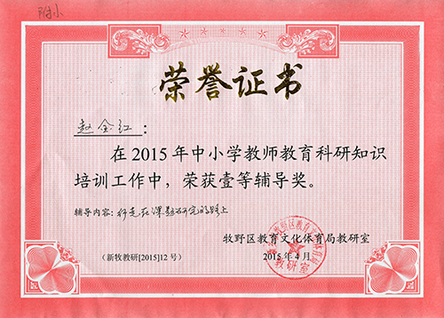 年牧野区中小学教育科研知识培训工作中,我校赵金红老师所做的《行走在课题研究的路上》,荣获一等辅导奖。