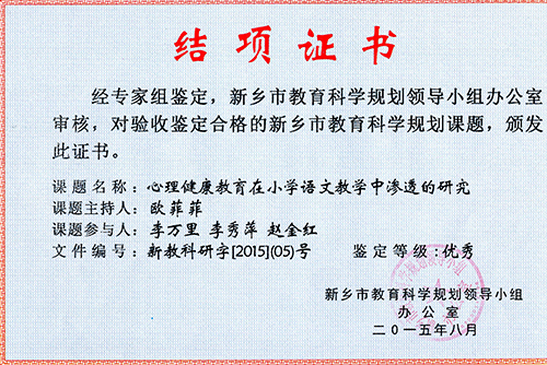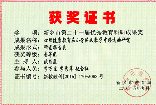 2015年9月,欧菲菲老师主持的研究课题《心理健康教育在小学语文教学中渗透的研究》通过市教科所结项,等级为优秀。在新乡市第二十一届优秀教育科研成果评比中,获一等奖。