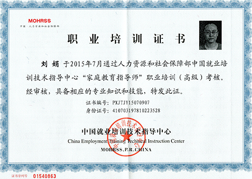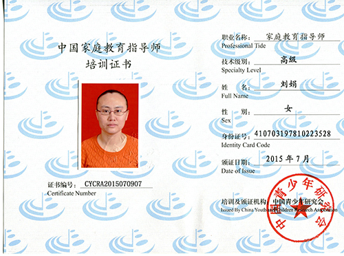 附小刘娟老师获得国家“家庭教育指导师”高级认证