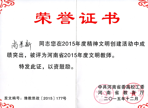 热烈祝贺尚景新老师被评为河南省2015年度文明教师,这是我校教师首次荣获此项荣誉。既是尚老师个人的荣誉,更是对我校精神文明建设成果的充分肯定。