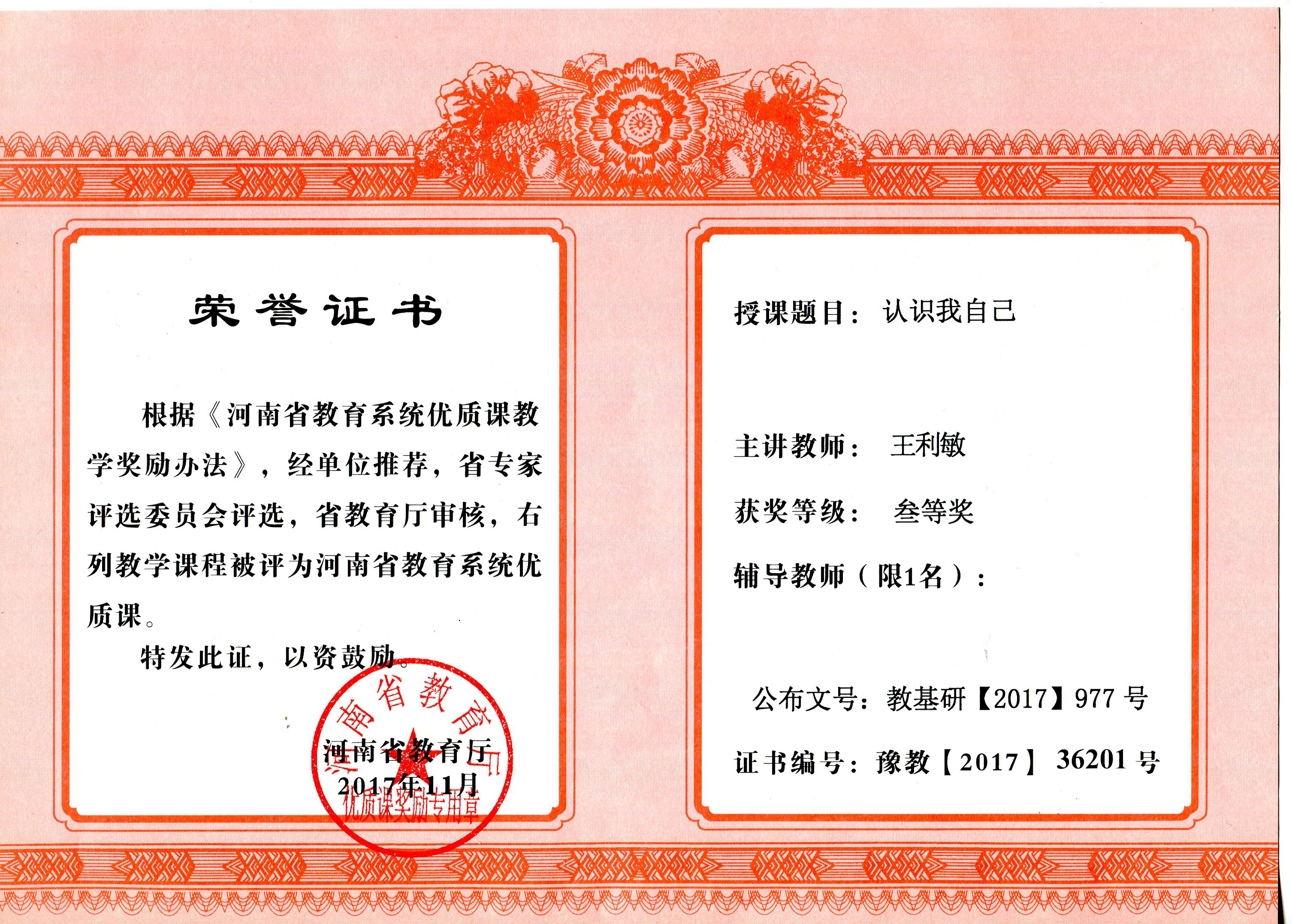 我校王利敏老师荣获省级优质课三等奖