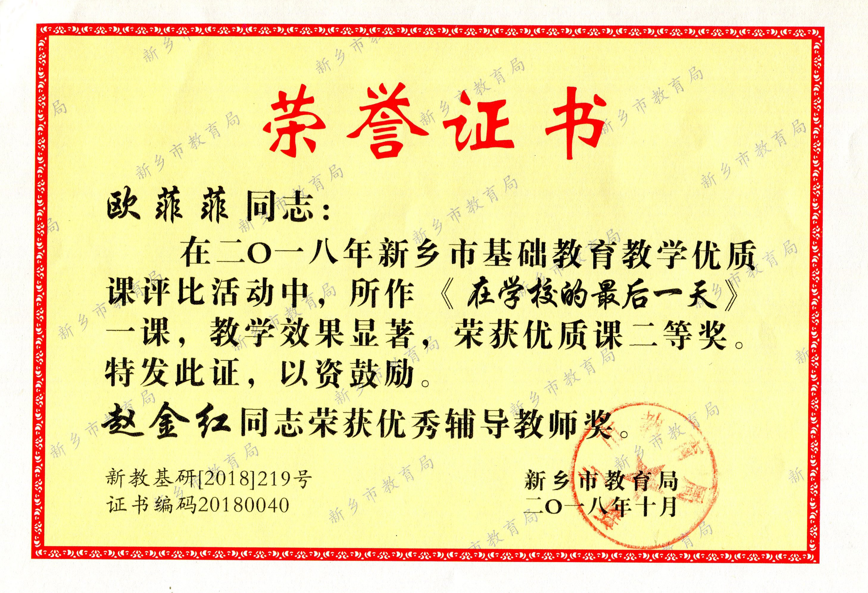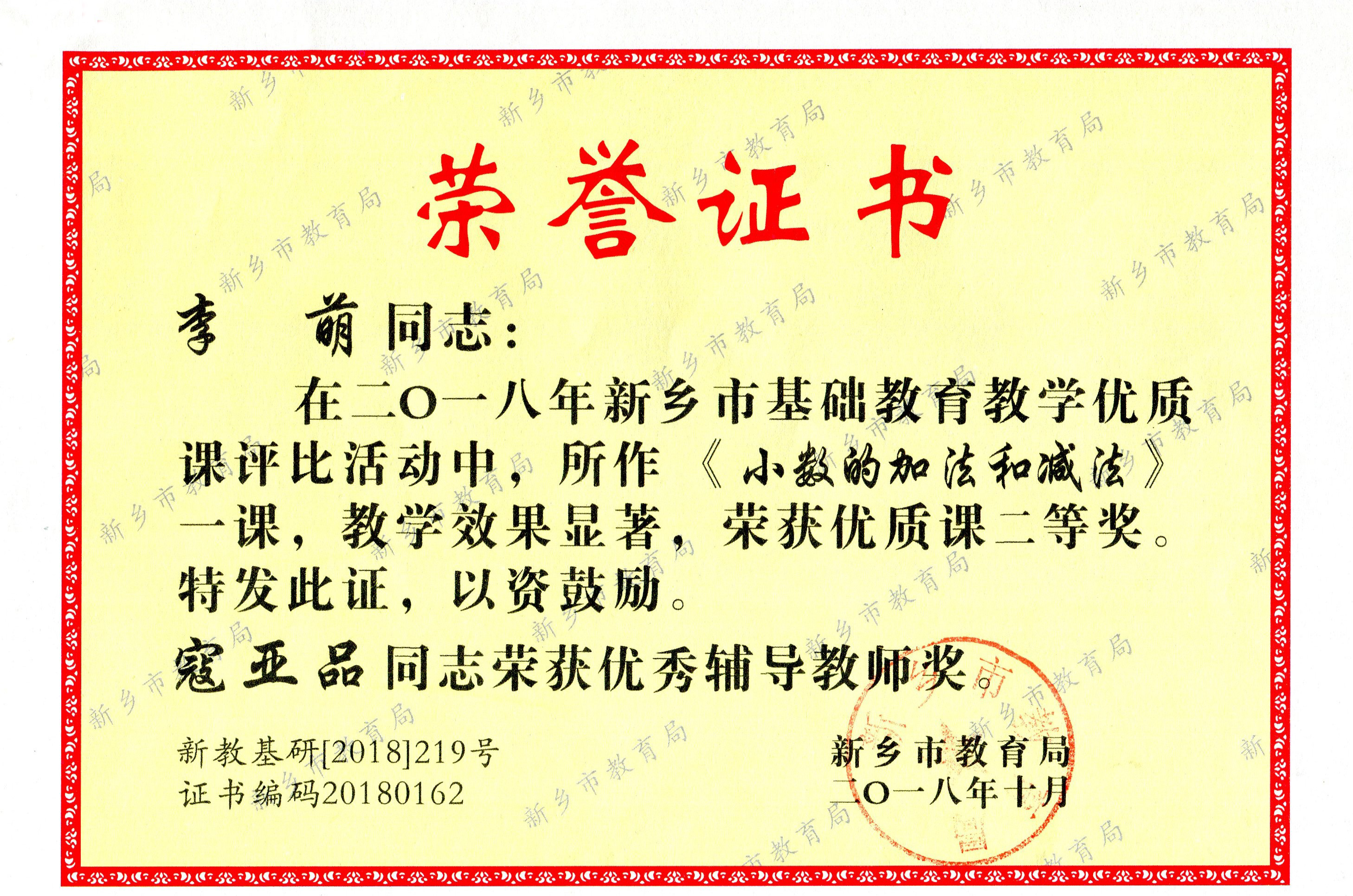 在2018年新乡市基础教育教学优质课评比活动中,我校欧菲菲老师执教的《在学校的最后一天》、李萌老师执教的《小数点的加法和减法》,均获二等奖。赵金红、寇亚品老师荣获优秀辅导教师奖。