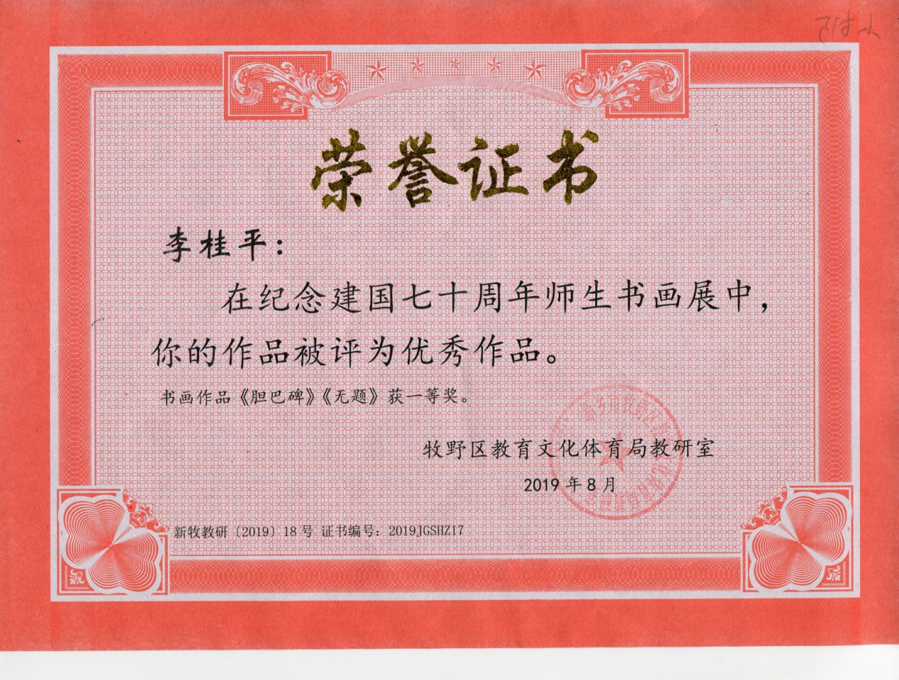 月,在牧野区纪念建国七十周年师生书画展中,我校李桂平老师的《胆巴碑》《无题》两件作品均获一等奖。