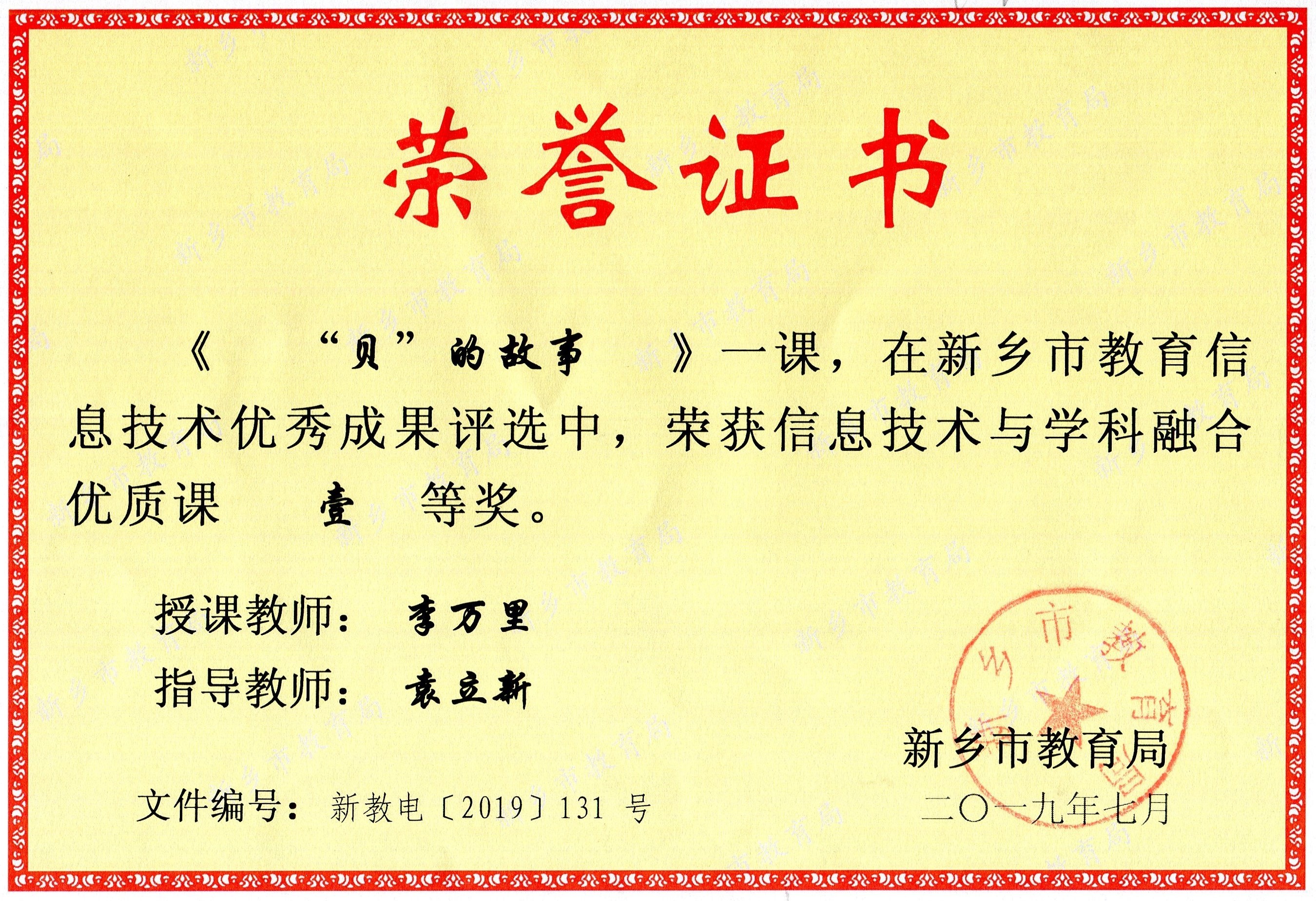 2019年7月,在新乡市教育信息技术优秀成果评选中,我校李万里校长执教的《“贝”的故事》一课,荣获一等奖。