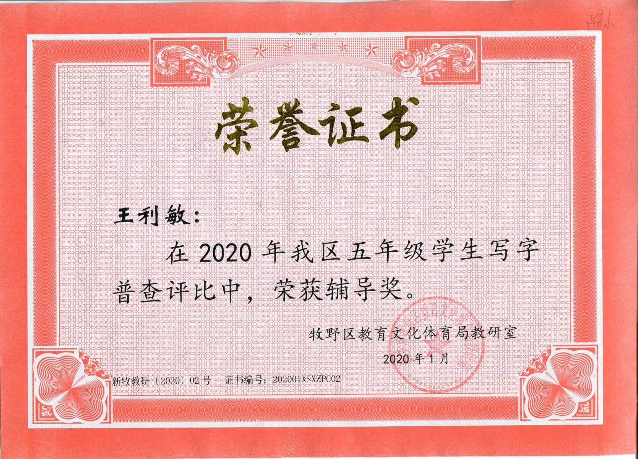 年牧野区五年级学生写字普查评比中,我校王利敏老师荣获辅导奖。