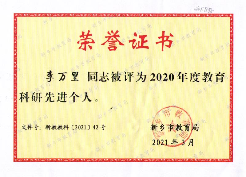 2021年3月,我校李万里校长被评为2020年度新乡市教育科研先进个人。
