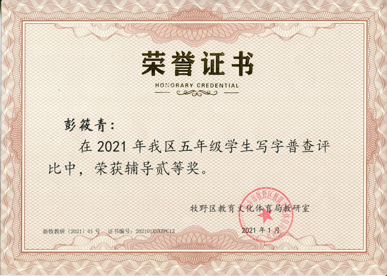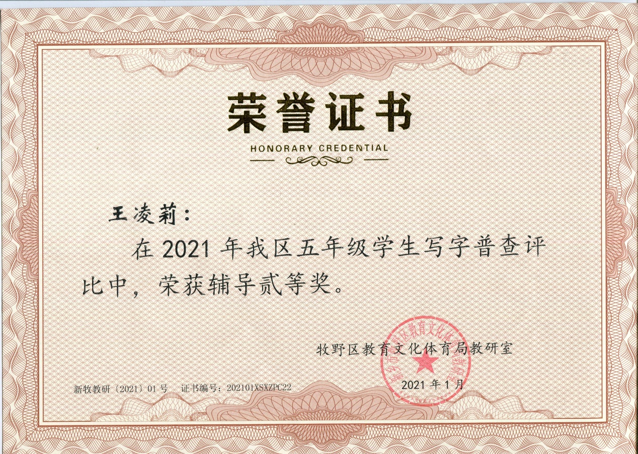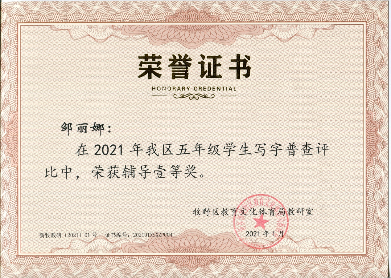 我校教师获牧野区五年级写字普查评比辅导奖。
